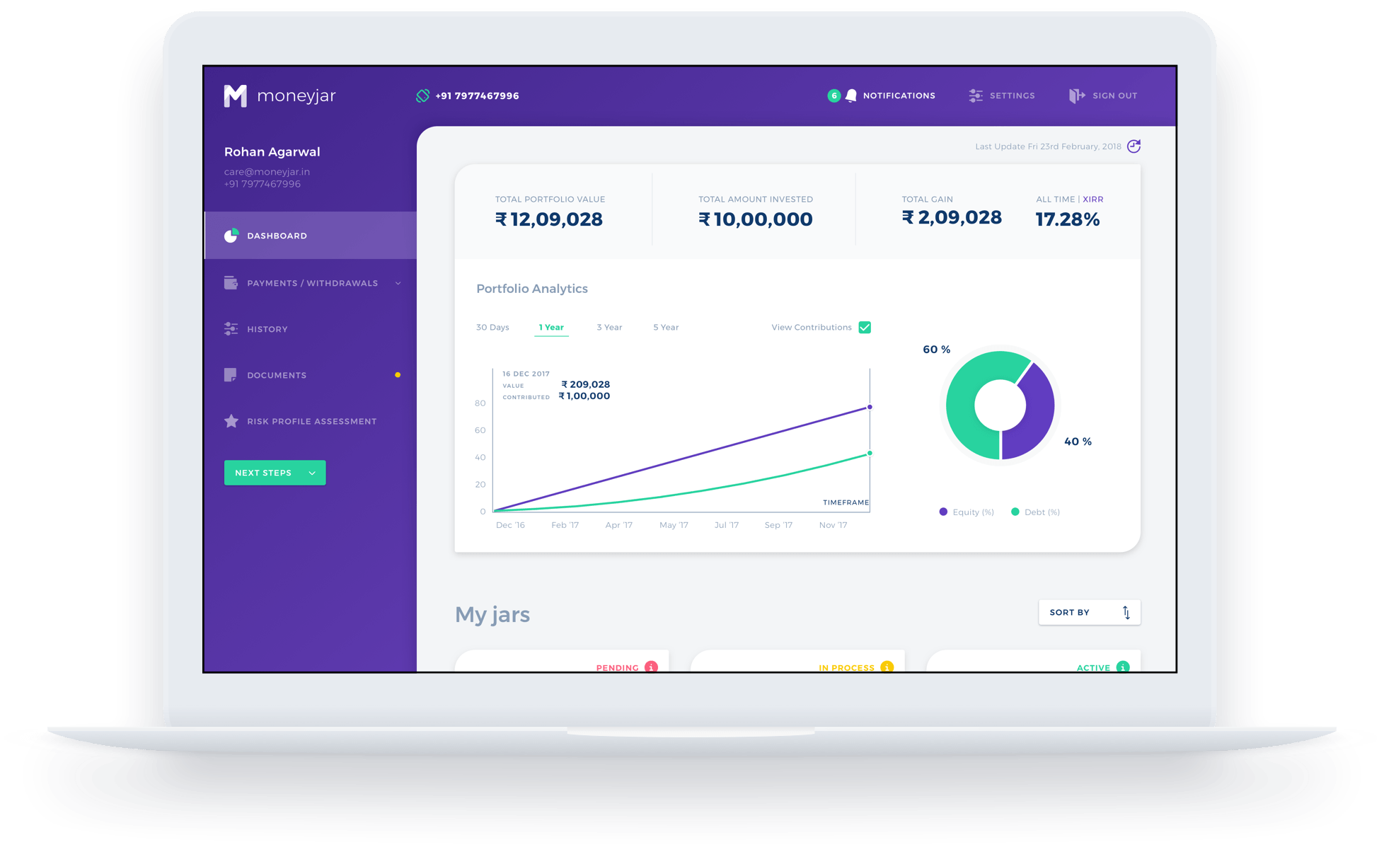 Invest online in mutual funds that are tailored to your exact needs. Moneyjar helps you make investing easy and rewarding. How it works 1. Choose a jar Do you already know what your financial goals are? Great! You can 'Build your Own Jar'. Have no clue where to begin? Fret not, choose our easy-to-grasp 'Pre-made Jars'. 2. Register and fund your jar Registration is a chore, but we promise it will be just this once. Get that out of the way, choose your mode of investment (Lumpsum or SIP) and you are good to go! 3. Monitor and optimise Moneyjar constantly monitors your portfolio and prompts you when any of your investments need to be replaced or rebalanced. You can also add new jars or add money to existing jars.