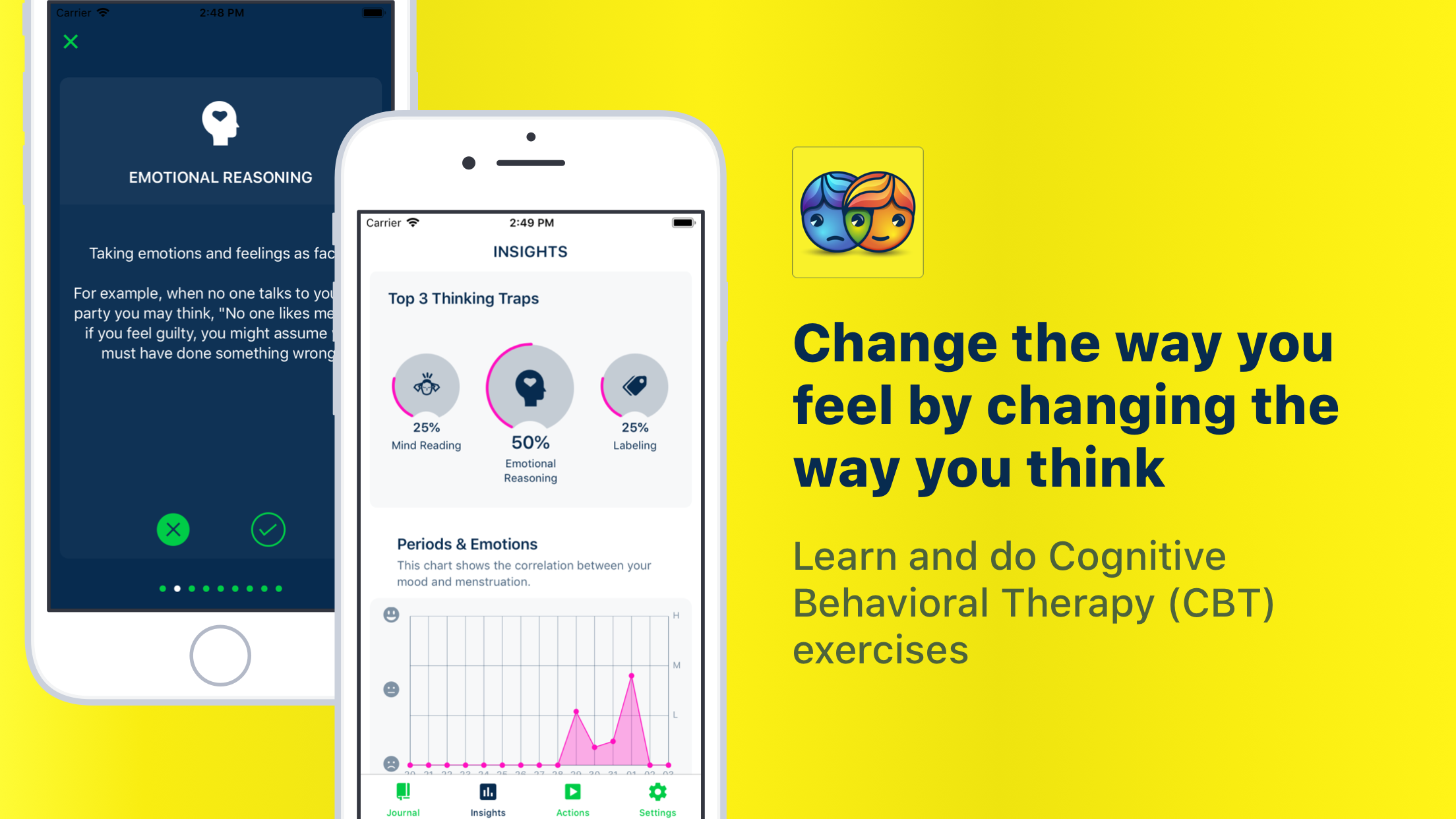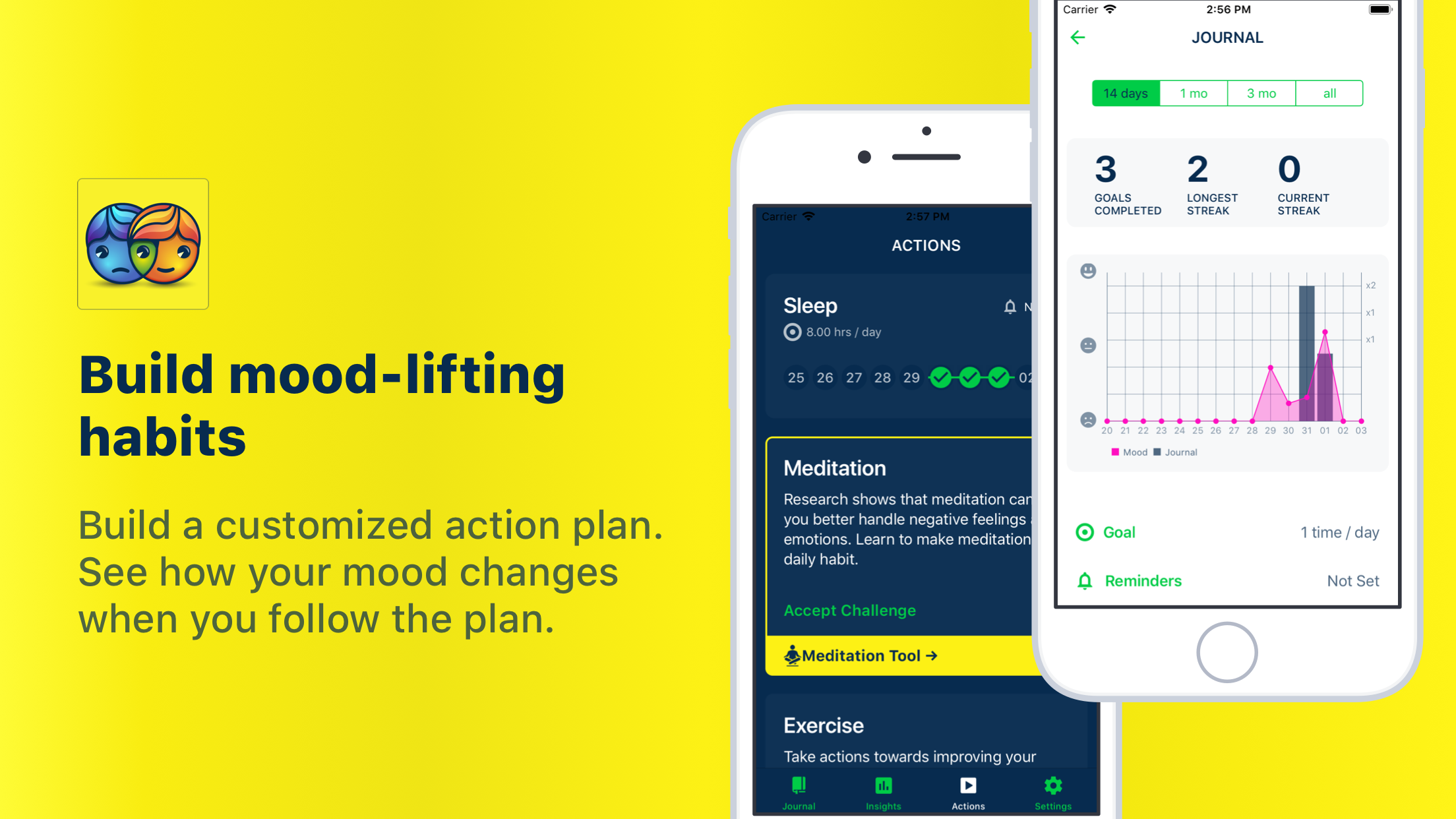 Mooditude is your guide to an elevated mood. It is your private journal, mood tracker and mental fitness app designed to help build resilience to stress and anxiety. Mooditude uses CBT exercises to change the way you feel by changing the way you think. Record your mood and the situation. Mooditude keeps track and provides insight for improvement. Follow a plan to build healthy habits that will uplift you. FEATURES :: Private and secure. Your data never leaves your device and protected by a passcode :: Highly personalizable. Chose from multiple color themes JOURNALING ======================== :: Easy journaling — two taps and you're? done! :: Write as much as you want :: Add unlimited photos and videos with your journal entry MOOD TRACKING & CBT ======================== :: Track your mood :: Add situations and factors to your mood entry with few taps :: Hundreds of well-designed icons to create custom situations :: Perform CBT exercises -- reflect on your automatic thoughts -- identify thinking traps -- look back on your notes and enrich them with custom prompts :: Tips, jokes, motivational quotes, and affirmations ACTION PLAN + BUILD HEALTHY HABITS ======================== :: Build healthy habits like journaling, sleep, exercise, meditation, etc. :: Set your own goals :: Mooditude automatically knows when you complete goals linked to Apple Health app :: Set unlimited reminders :: Track your medications :: Understand how different habits are affecting your mood :: Use meditation exercises to calm and relax you :: Pick predefined meditation or create a custom one INSIGHTS ======================== :: Beautiful and informative charts show how your mood changed over time :: Identify triggers that make you feel happy, sad, depressed, stressed, or anxious :: Recognize the thinking errors that are making you depress or anxious :: For women, track your periods and see how they affect your mood Build resilience to depression and anxiety. Improve your mental health! Download Mooditude for FREE!