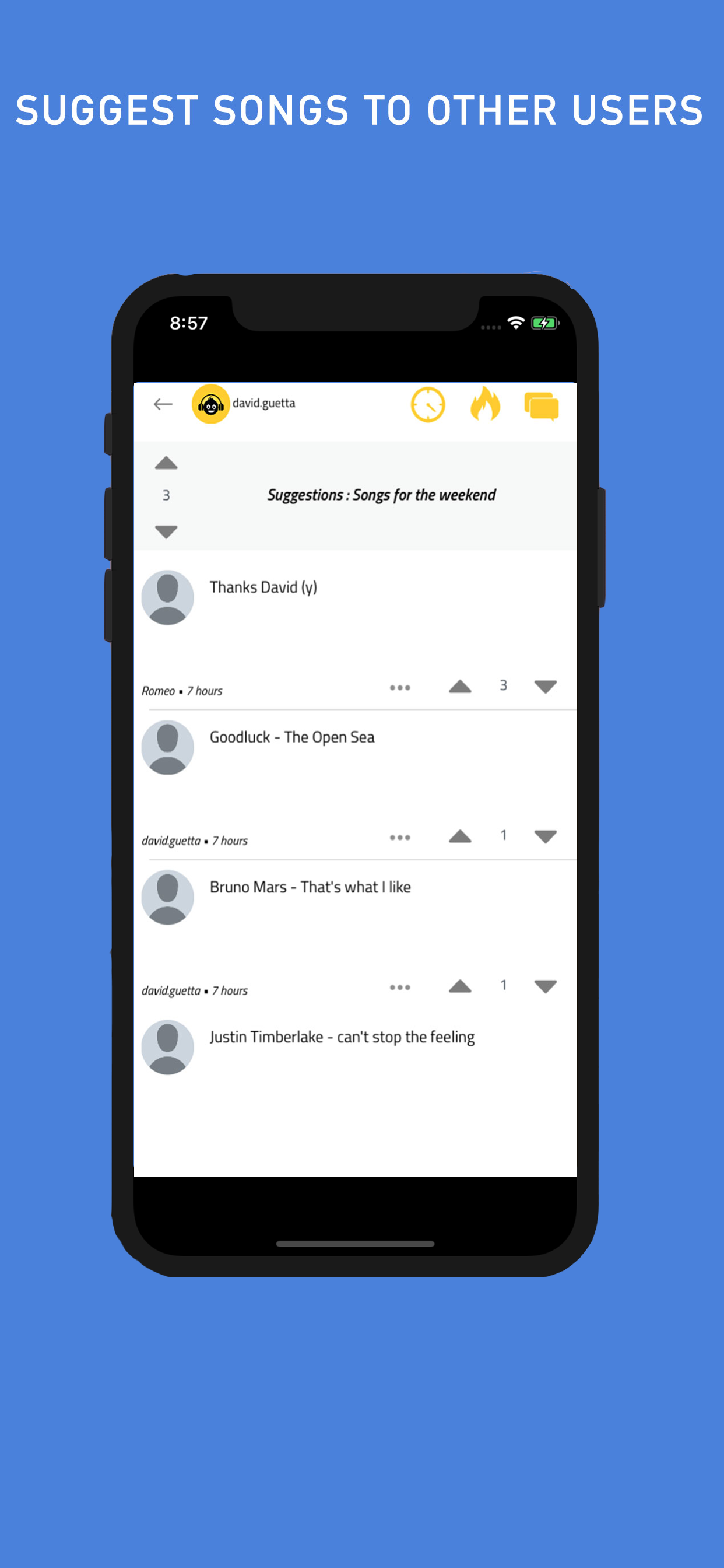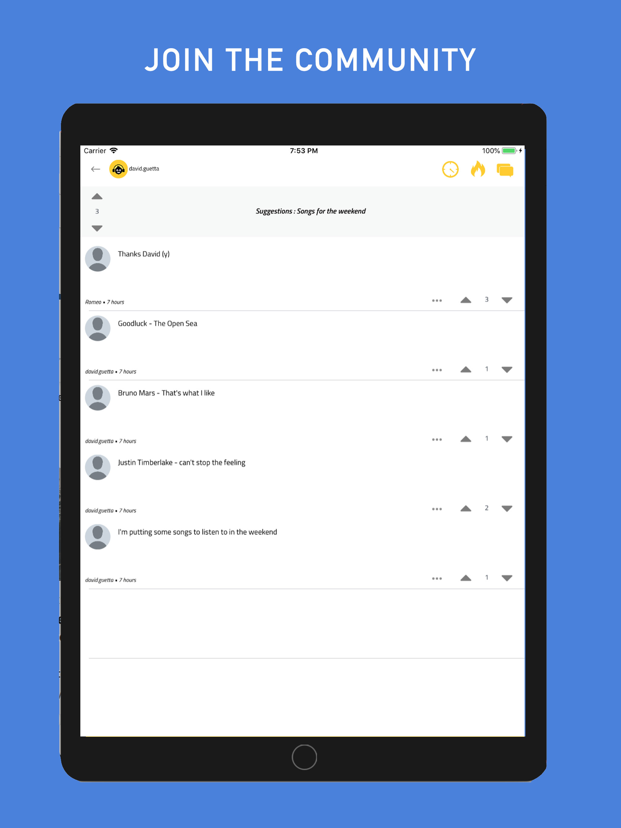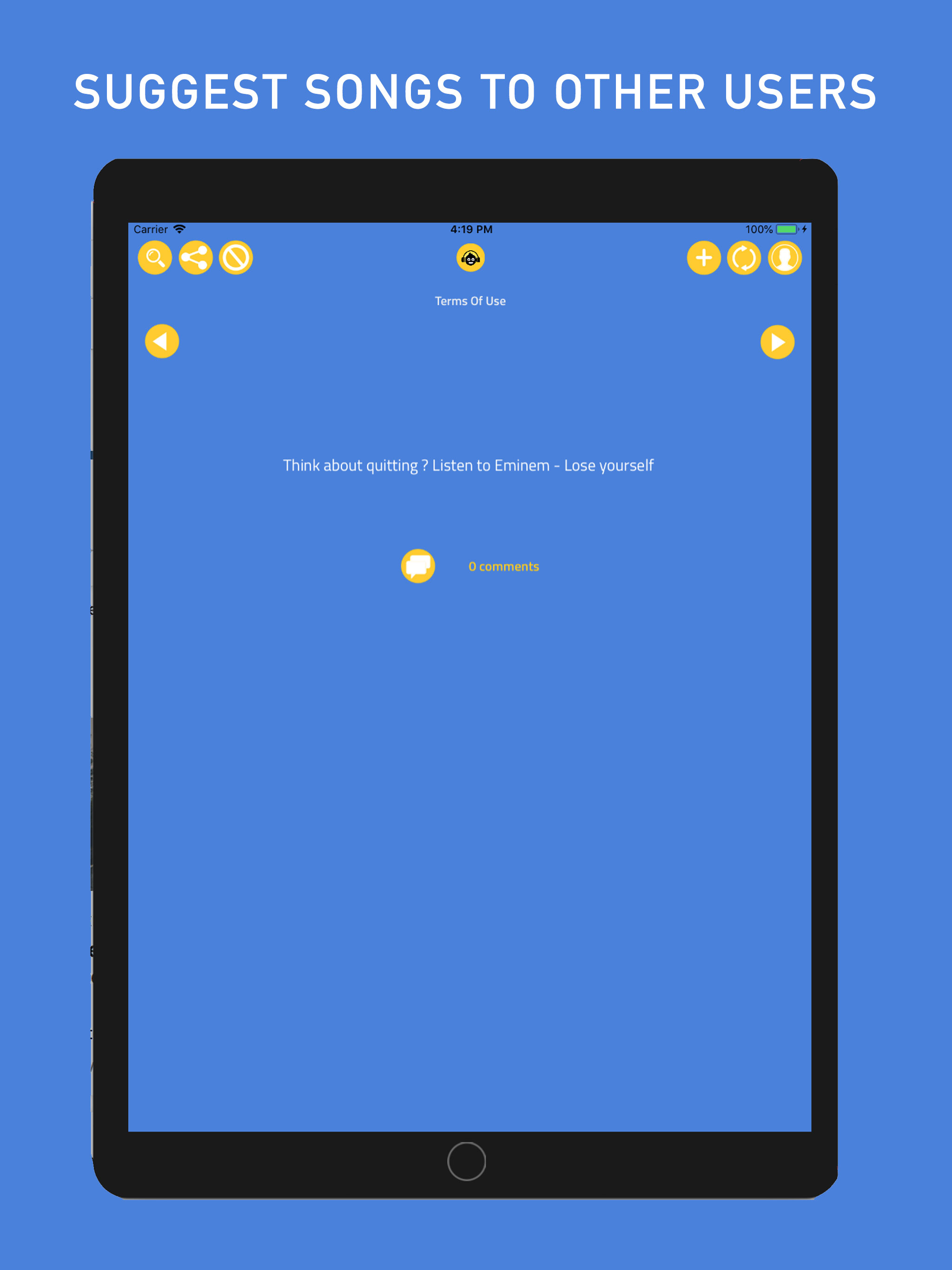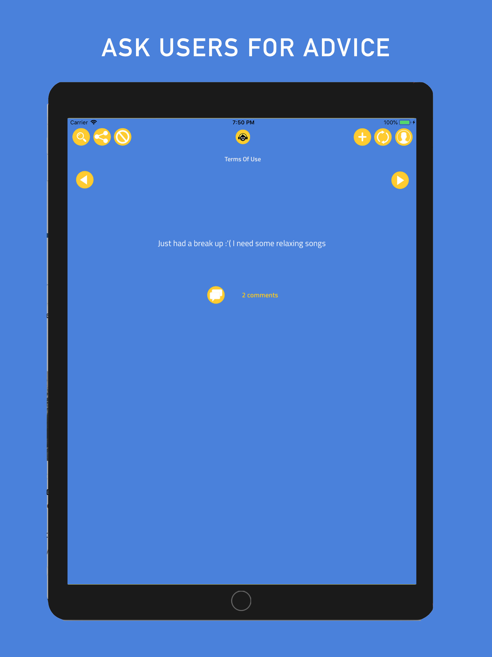 Moods and Songs is a social media app where users post requests / advices about the right song to listen to in a certain mood they are in and other users can comment their posts. – A user can write his post (request, advice or suggestions). – A user can consult others’ post and post a comment about it. – A user can up or down vote a post/comment – A user can report inappropriate/offensive content and it disappears immediately until we review it. – A user can check other users posts , comments and activities. The app contains terms of use that a user must accept to use the app and if a user is reported all his content will be invisible until we review it.