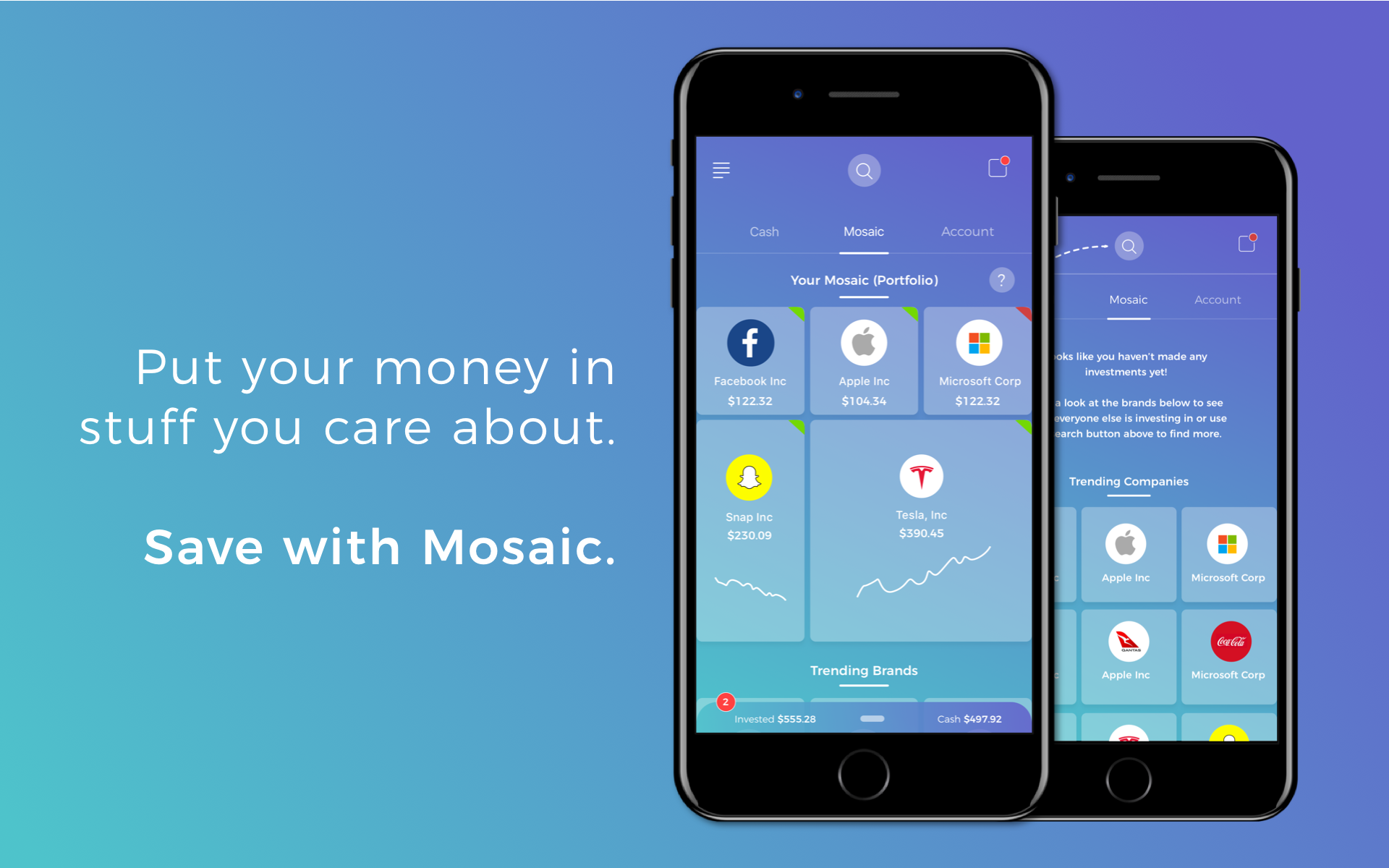 Mosaic is a fintech company based in Sydney, Australia. With Mosaic, you can invest any amount you want into companies around the world for less than a dollar. The aim is to encourage people to gradually move money from savings which don't generate a return on investment into assets they genuinely care about.
