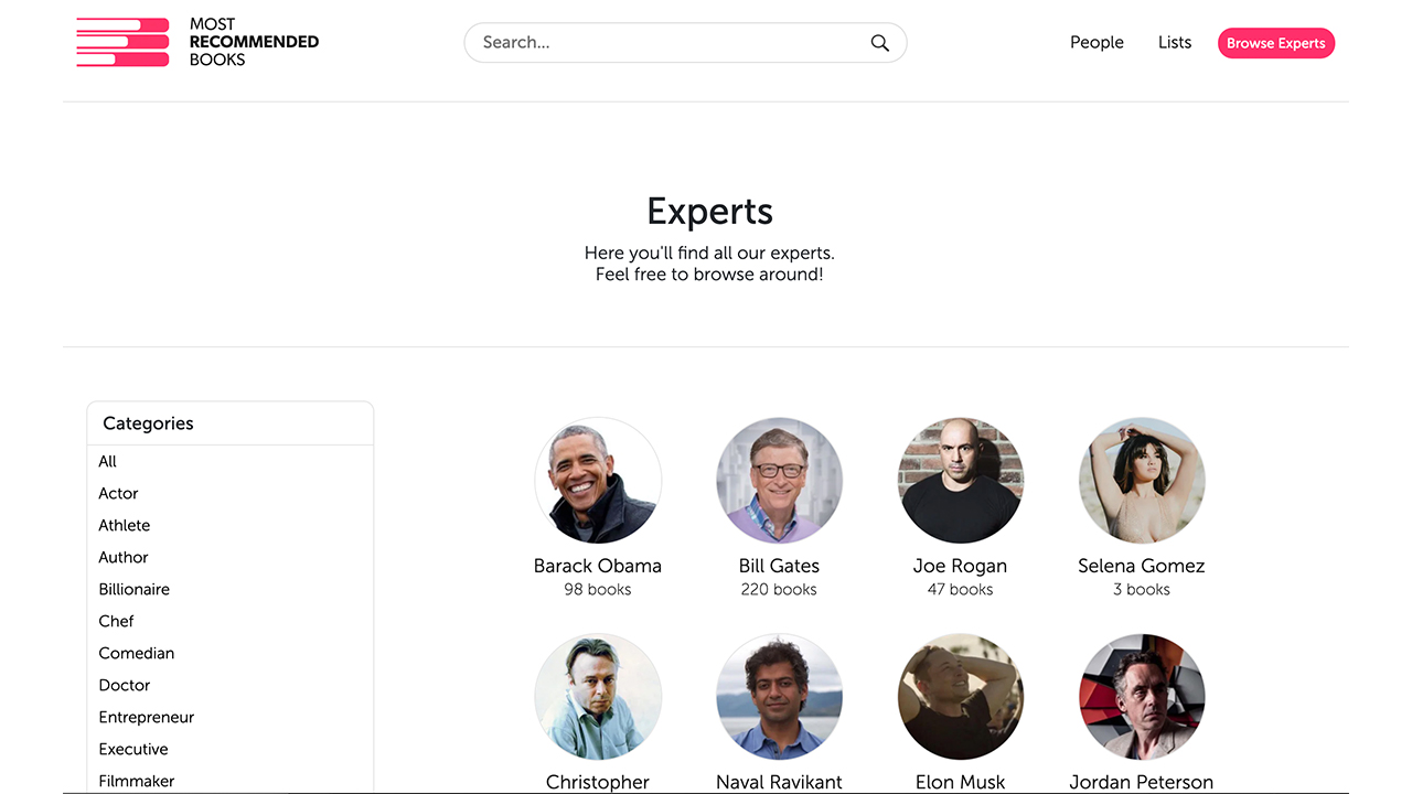 Most Recommended Books helps you discover books recommended by the world's most influential people. We feature 400+ experts who have recommended 5000+ books (with more added every month!) Also, our recommendations are 100% verified.