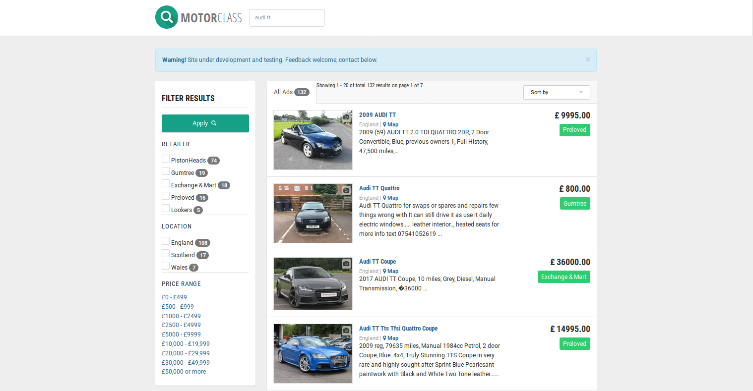 Motorclass was developed by myself to tackled an urge to learn web development. I started the project around a year ago, finally launching in August 2017. The project still requires some heavy work to make it a well-rounded product, but overall I'm pleased with the outcome. Feel free to take a look. There are a limited number of sellers at this point, totaling around 20,000 results. Over the next month, I aim to up this to 10-20 sellers and over 100,000 results with refined search functionality being added. contact me at - [email protected]