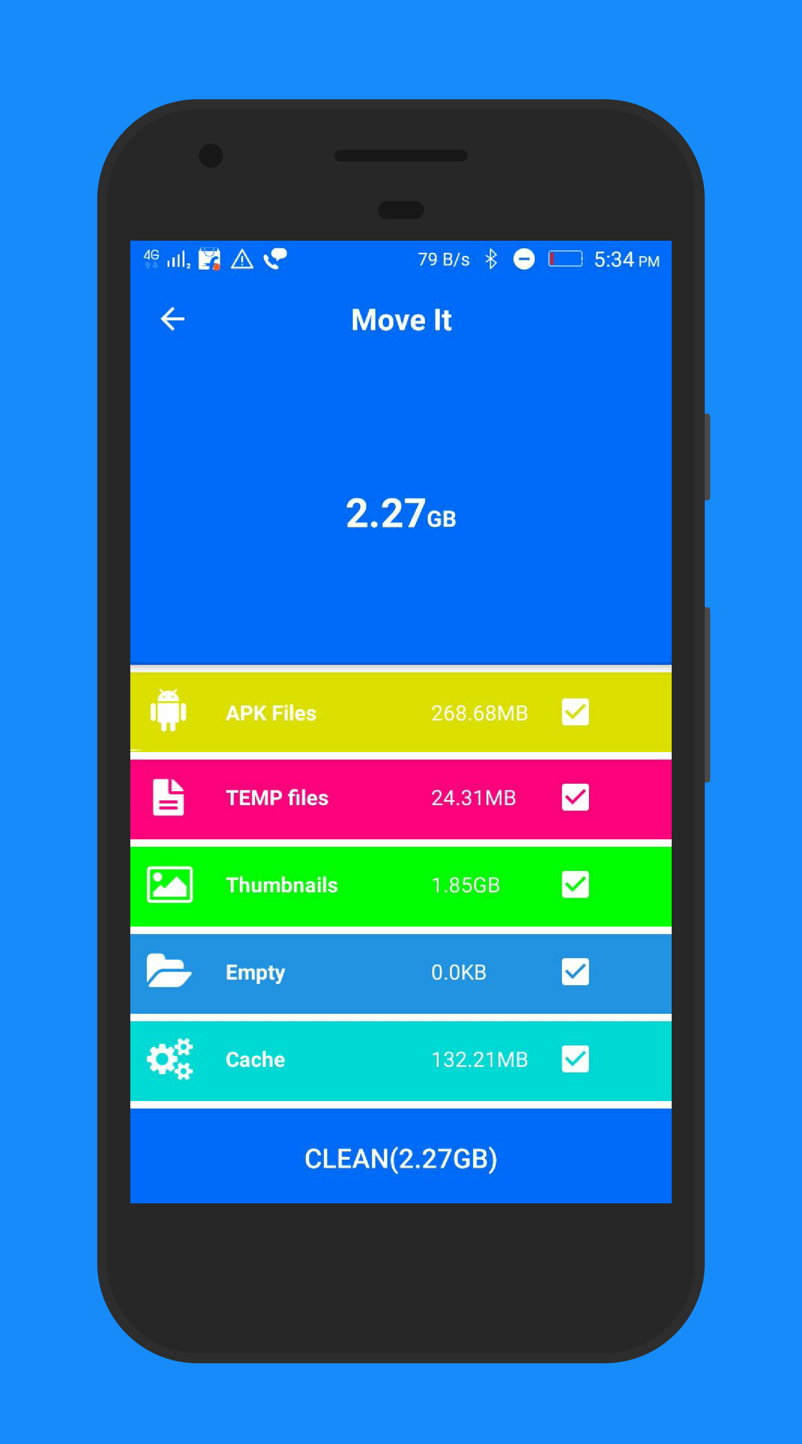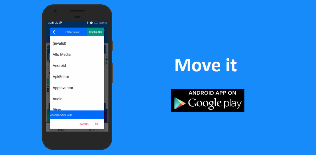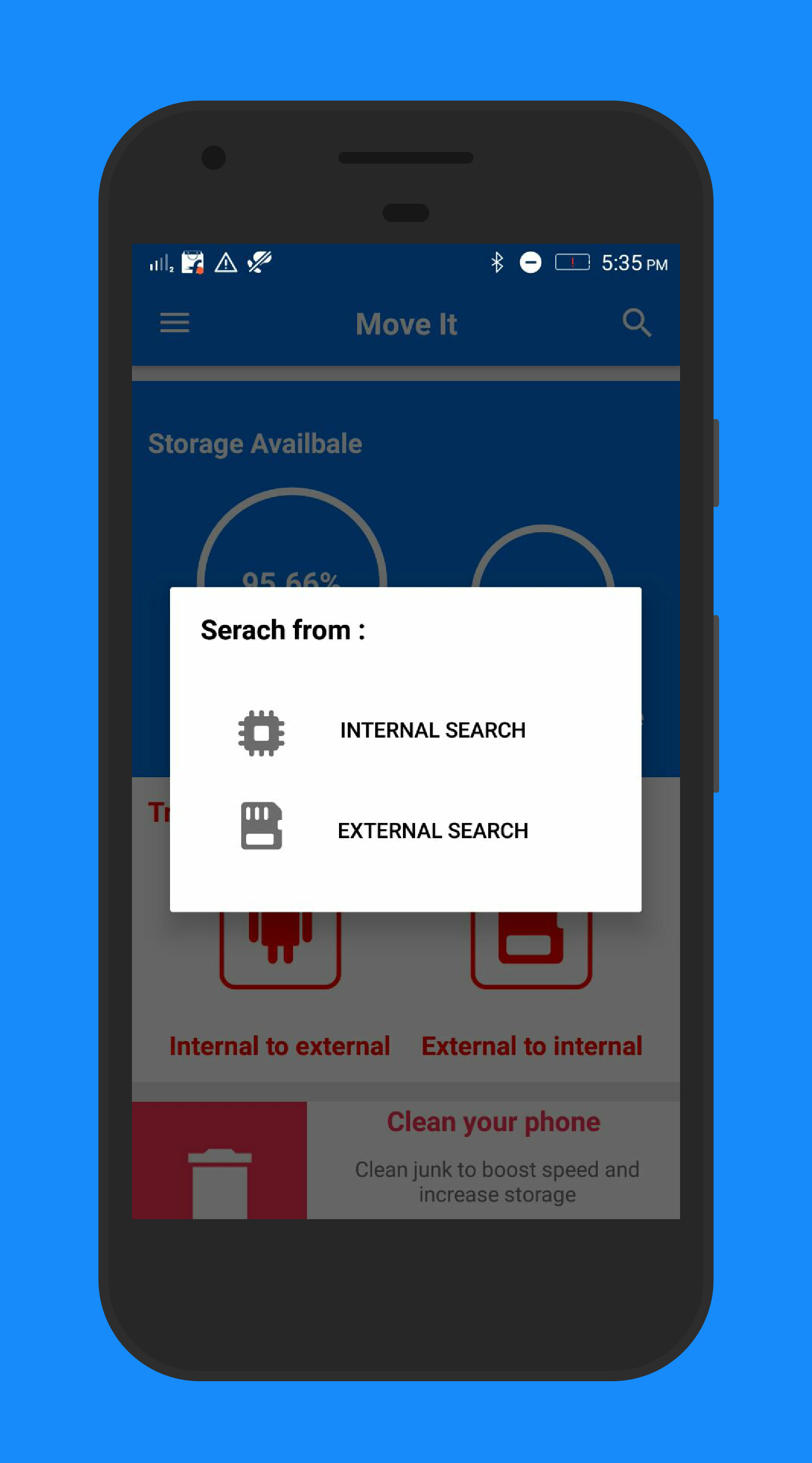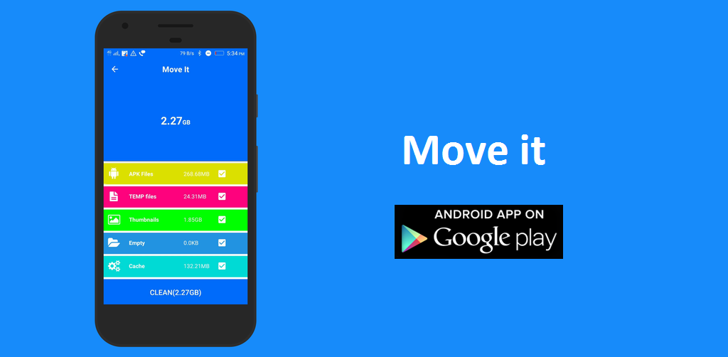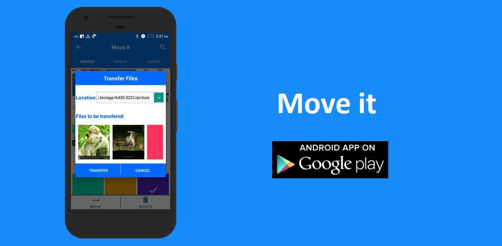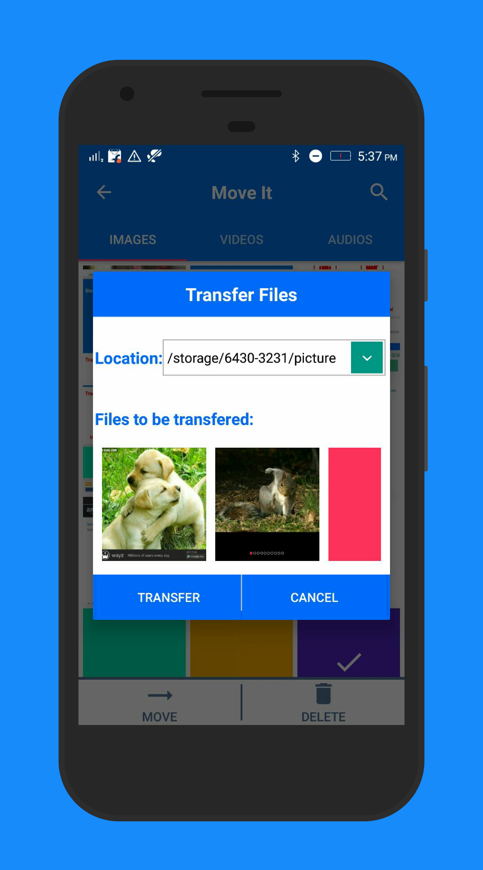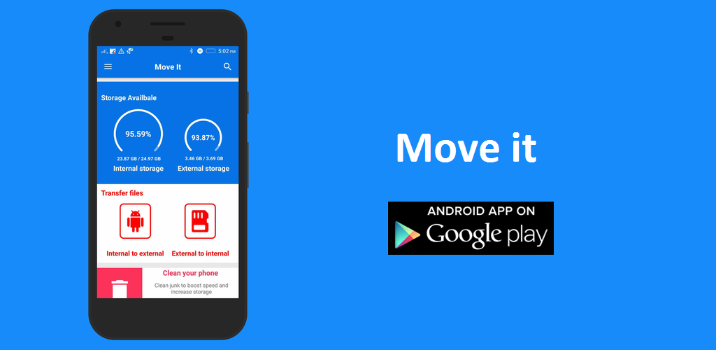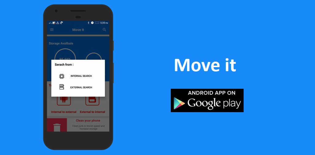 The ultimate app to transfer your image,video or audios to SD Card and vice versa. Images,videos or audios can be moved to SD Card and also from SD Card to internal storage using MoveIt. MoveIt also help's you in cleaning your phone's Junk and increasing your Phone's storage and speed. Features- * Images,videos or audio can be transferred to SD Card using MoveIt. * Images,videos or audio can also be transferred to Internal storage using MoveIt. * You can clean your cache,apk files,temp files,thumbnails and empty folders using our cleaner. * You can also customize the app the way you like it. * Using MoveIt you can search Internal and external storage. Note - This app is in beta version and is still in development and may be unstable. For any feedback/inquiries please be free to mail us at [email protected].