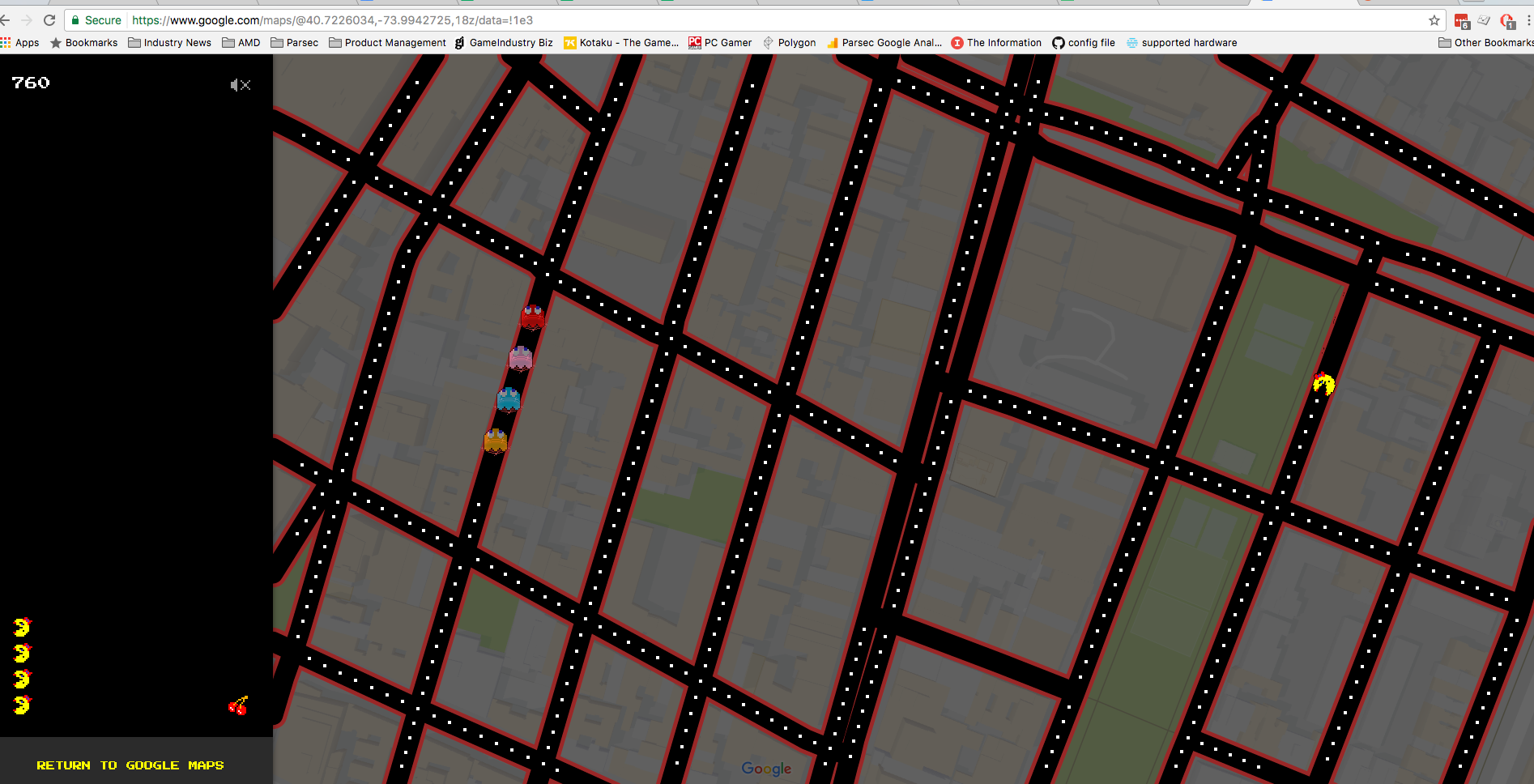 You can celebrate now by playing Pac-Man around your neighborhood on Google Maps. Google has enabled the ability to play Ms. Pac-Man using the streets in most areas on Google Maps. Provided there are enough roads in the area you're looking at, you can play a working version of the game, complete with ghosts, sound effects, and music. On the web version, Ms. Pac-Man is turned on by clicking a button in the bottom left; the arrow keys are then used to control your character. You can also play in the mobile app--you won't miss the option to turn it on--by swiping on the screen.