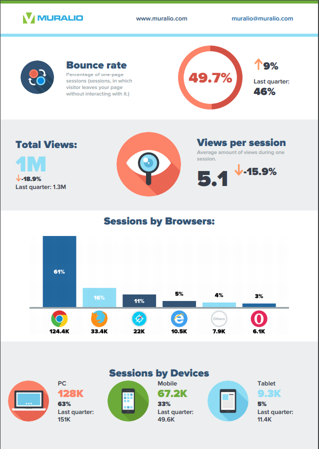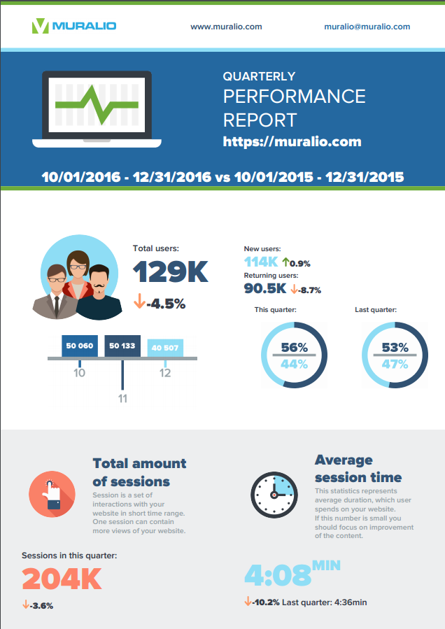 Muralio automatically converts Google Analytics data into visual infographic reports. With a simple dashboard, you can generate a quick overview of your website in seconds and share the report with clients.
