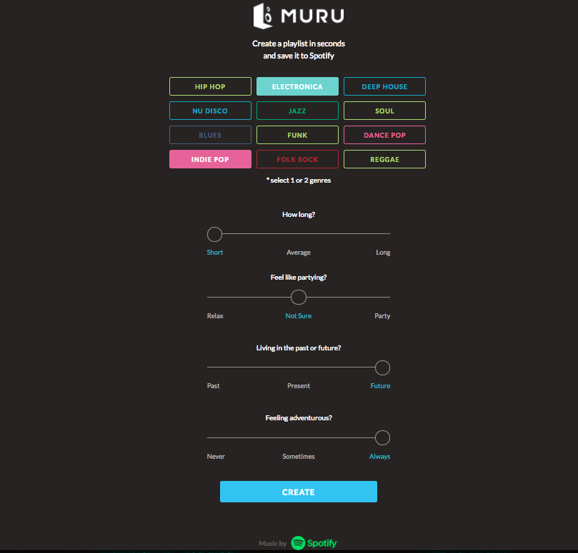 Ever tried creating a Spotify playlist? It's incredibly time consuming and hard...Not anymore With Muru you can create a playlist in a matter of seconds. Blues to Deep House, Indie Pop to Electronica - whatever you choose, Muru will always find the perfect songs to create the perfect set, just like a DJ. While you listen to your playlist you can adjust the Tempo, Energy, Popularity and Era of the song selection so that the music is just right for you. Muru is available in a web widget for all Spotify users at https://muru.info/playlist or as a native app for Spotify premium users at https://itunes.apple.com/us/app/muru/id1062422852