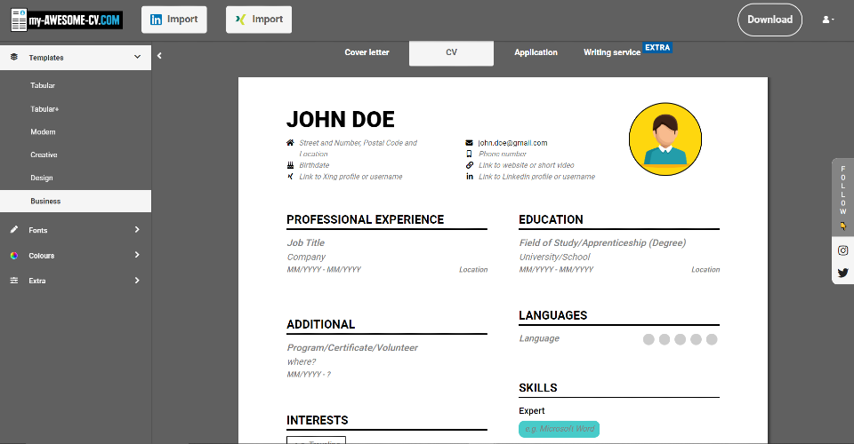 Create your CV effortlessly with our resume builder. It's free! Save time with modern templates, customize with design options, and download high-quality PDFs. No watermarks or hidden fees. Additionally, you can get your CV checked for as low as 29€.