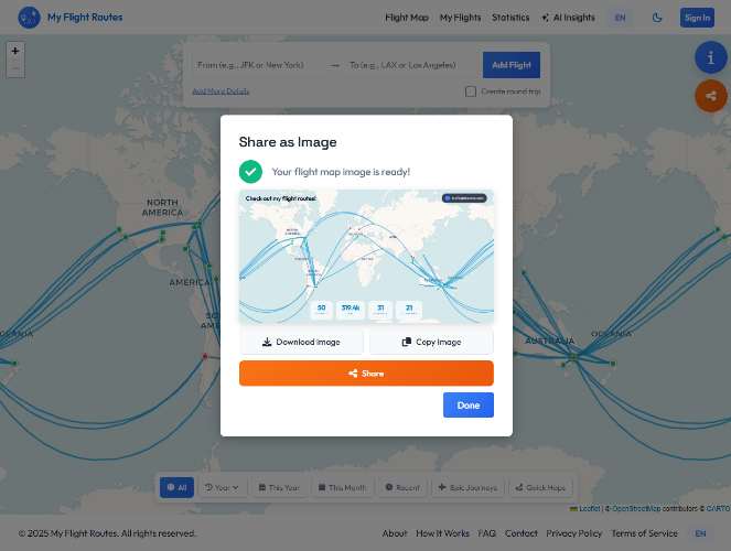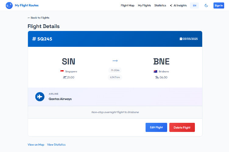 No sign-up required. Open the app and start immediately, everything works offline in your browser. Use it as a quick calculator to check a single flight distance, or build your complete travel diary with an interactive world map. Works offline, no account needed. Your data stays local by default. Create an account only if you want cloud sync. Free, no paywall, no tricks. AI-powered travel insights. Shareable map images and links. CSV import for bulk flights.