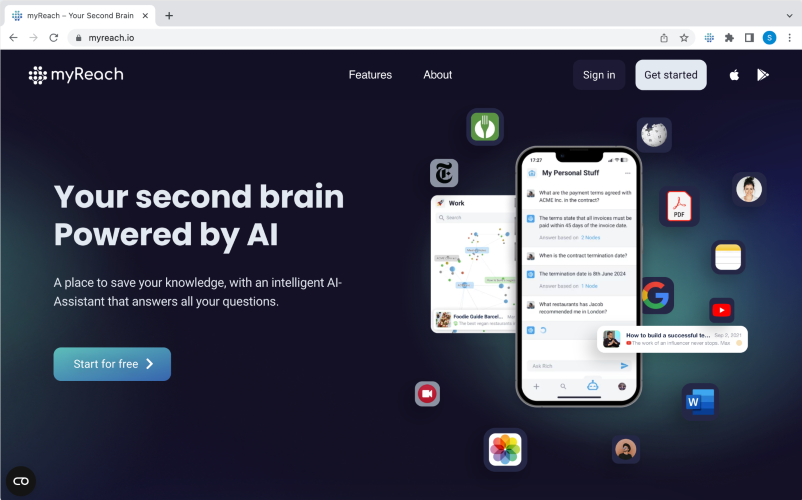 myReach is a free mobile app that works like your second brain, powered by AI. It’s a place to save your knowledge, with a personal ChatGPT like an intelligent AI-Assistant that answers all your questions. You can save any digital data (files, websites, pictures, notes, contacts, etc) and connect them to other relevant things. This way, you can find things quickly when you need them. You don’t need to remember exact names of files, or locations of pictures - just something about their context. You can also take it one step further and ask questions about your things, through our AI-powered Chatbot called Rich. • For instance, rather than reading through endless pages of a contract, ask Rich about it. You don’t even need to find the PDF, just open the Chat and ask away. • What if you’ve found an interesting article but it’s too long? Ask Rich to summarise it. • And if you’re travelling somewhere and a friend once sent you recommendations about the place. Get Rich to remind you what those were. As long as it’s saved in myReach you can ask Rich anything about your things and it will answer. It’s like a ChatGPT, but for your things. In essence, myReach is YOUR PERSONAL KNOWLEDGE HUB, POWERED BY AI AND DESIGNED FOR PRODUCTIVITY.