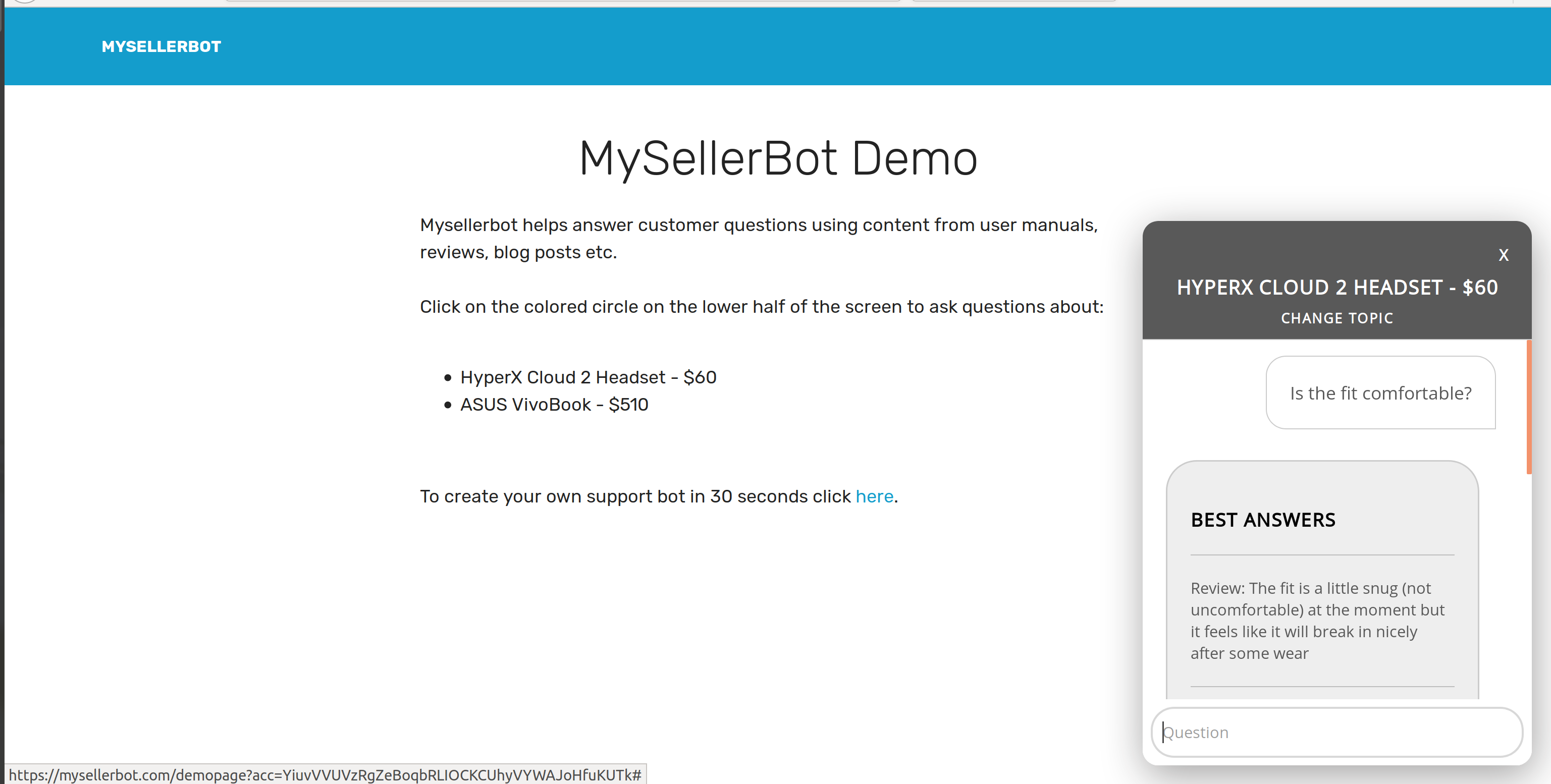 MySellerBot is an embeddable chat widget for your Shopify store that can answer 30-40% of highly technical queries about your product segment without any training. Just feed in content/answers from PDFs, manuals, reviews and you are good to go. It is often very clever in answering questions when the exact answer isn't provided in your Knowledge Base. Current we have Demo's in our website for the following Products -Electronics -Sports and Outdoors -Beauty -Home and Kitchen -Health and Personal Care