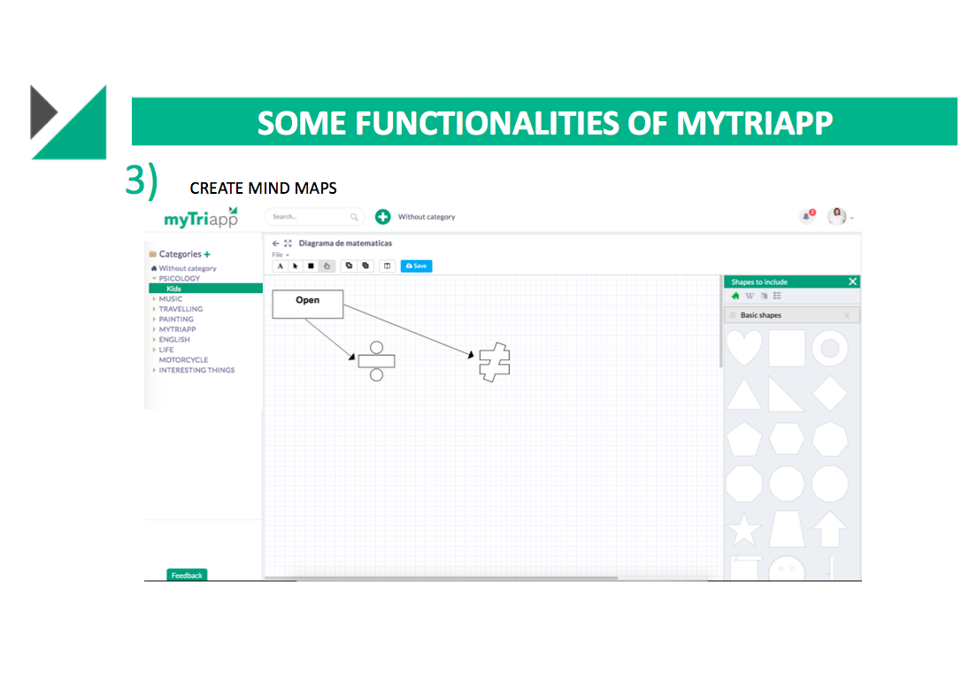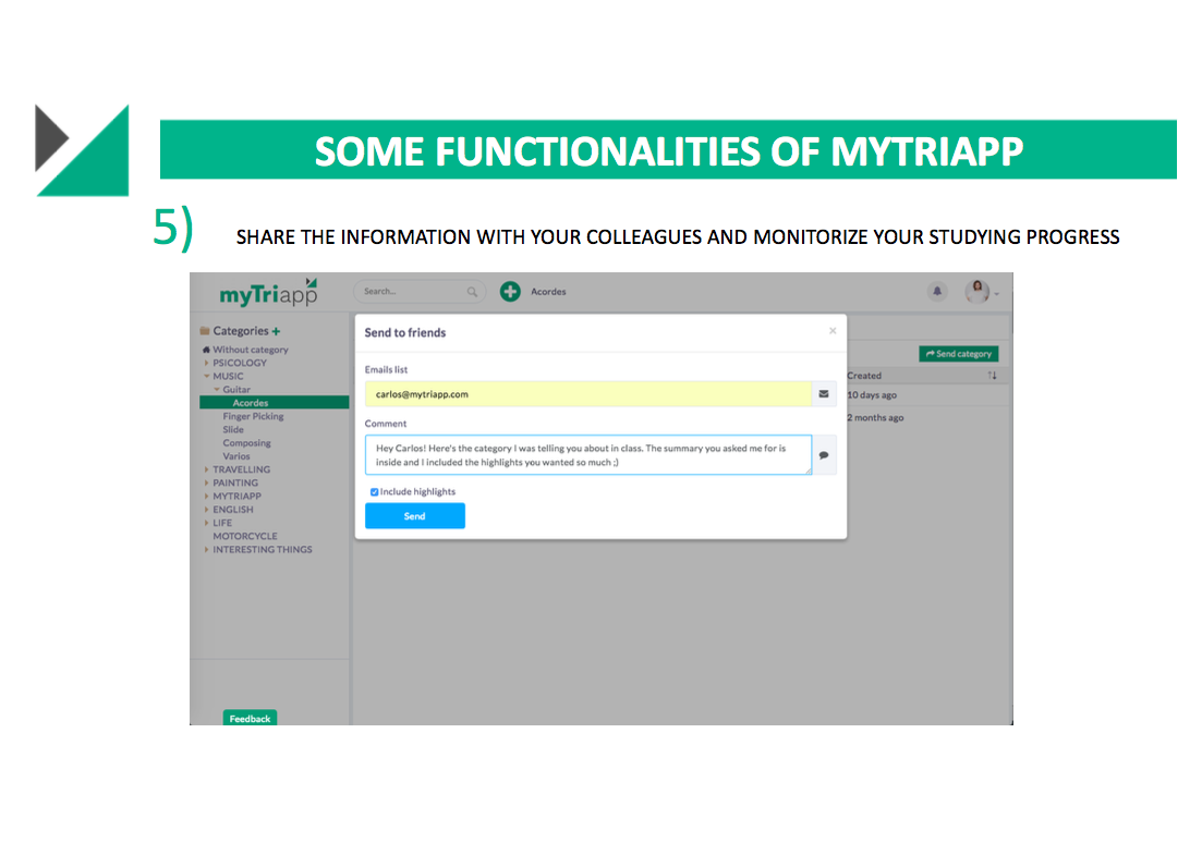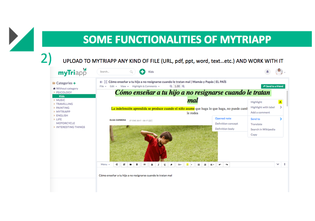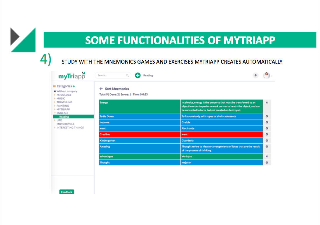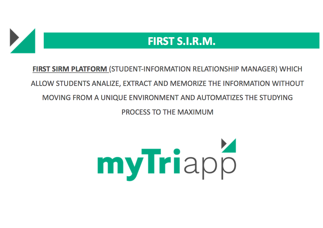 Mytriapp is the first S.I.R.M. (student-information relationship manager) ever. It is a web App which allows students of any kind (college, uni, master, course or hobby) to save time and effort when it comes to synthetising and studying their information. Mytriapp include many features. For starters, you can sync it with Google Drive and Dropbox, in order to have on it all your files. You can also upload manually any pdf's, powerpoints, word files etc. that you want to work with, as well as any plain text or URL that you find interesting. Once the document is in Mytriapp, you can underline in any color, comment any part of the text, search in wikipedia or translate, without moving from the same screen. Creating summaries is incredibly easy and it also allows you to include Bibliographic citations or the bibliography of the document you are working on with one click. Other features are it's mind maps, and the mnemonic games and exercises Mytriapp will use for your self-evaluation.