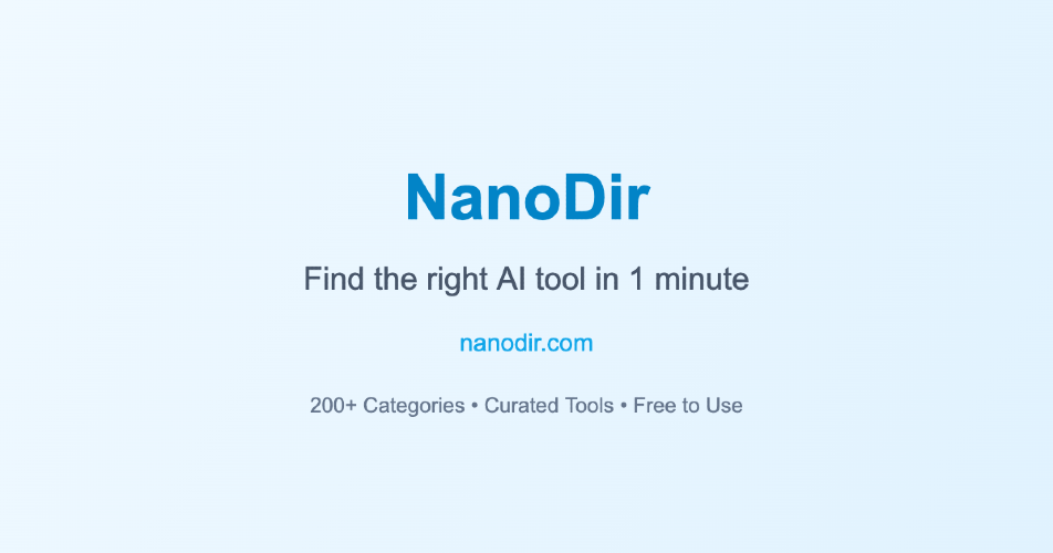 NanoDir is a comprehensive AI tool directory designed to help users find the perfect AI tool in under 60 seconds. Instead of browsing endless lists, users can filter by task, use case, and budget to quickly discover the best-matched tools.\n\nKey Features:\n- 200+ curated AI tool categories\n- Smart search and filtering by use case and budget\n- Detailed tool profiles with descriptions, pricing, and ratings\n- Regular updates with the latest AI tools\n- Free to use\n\nWhether you're looking for coding assistants, image generators, writing tools, data analysis solutions, or any other AI-powered tool, NanoDir helps you decide fast.