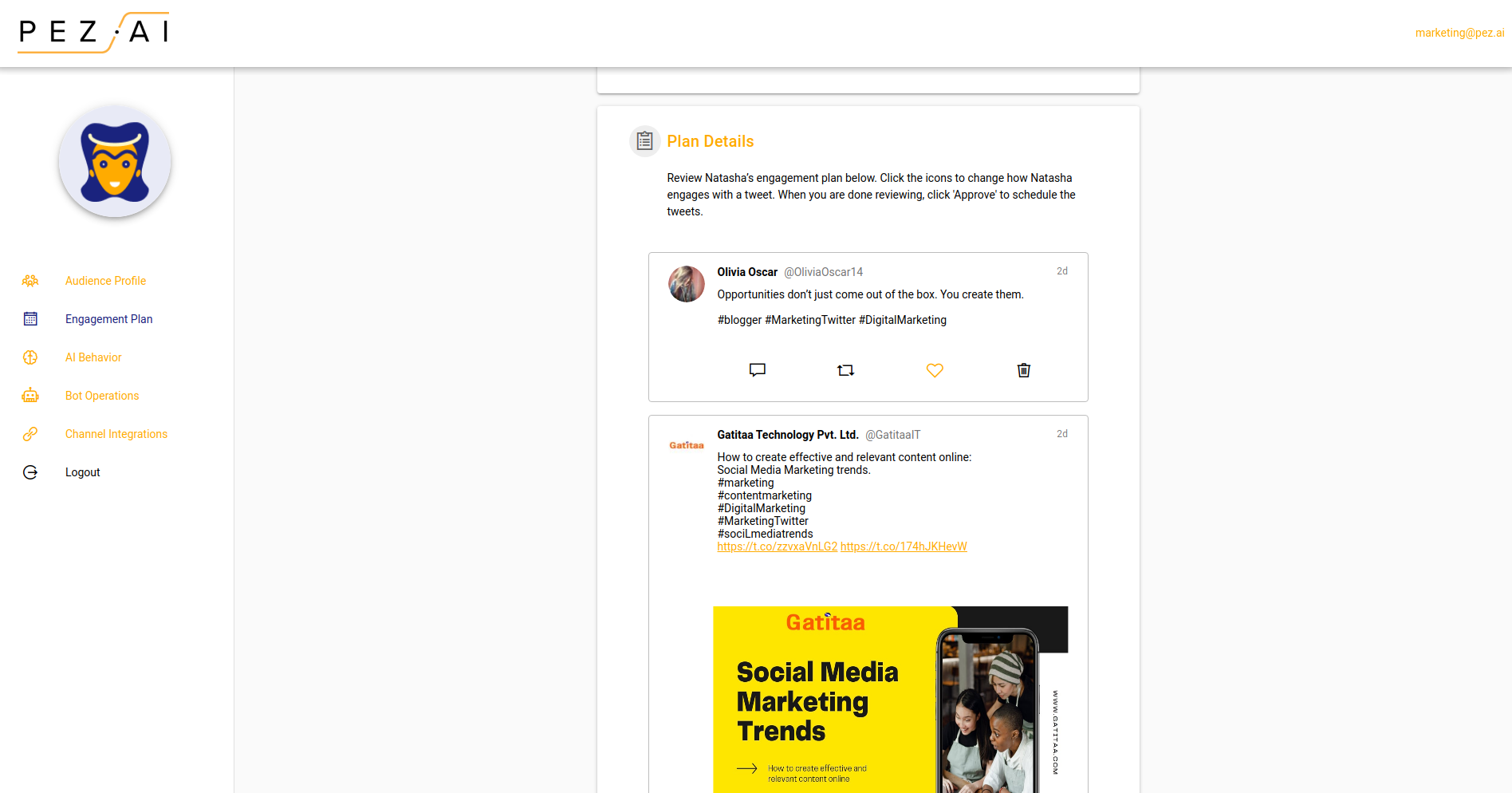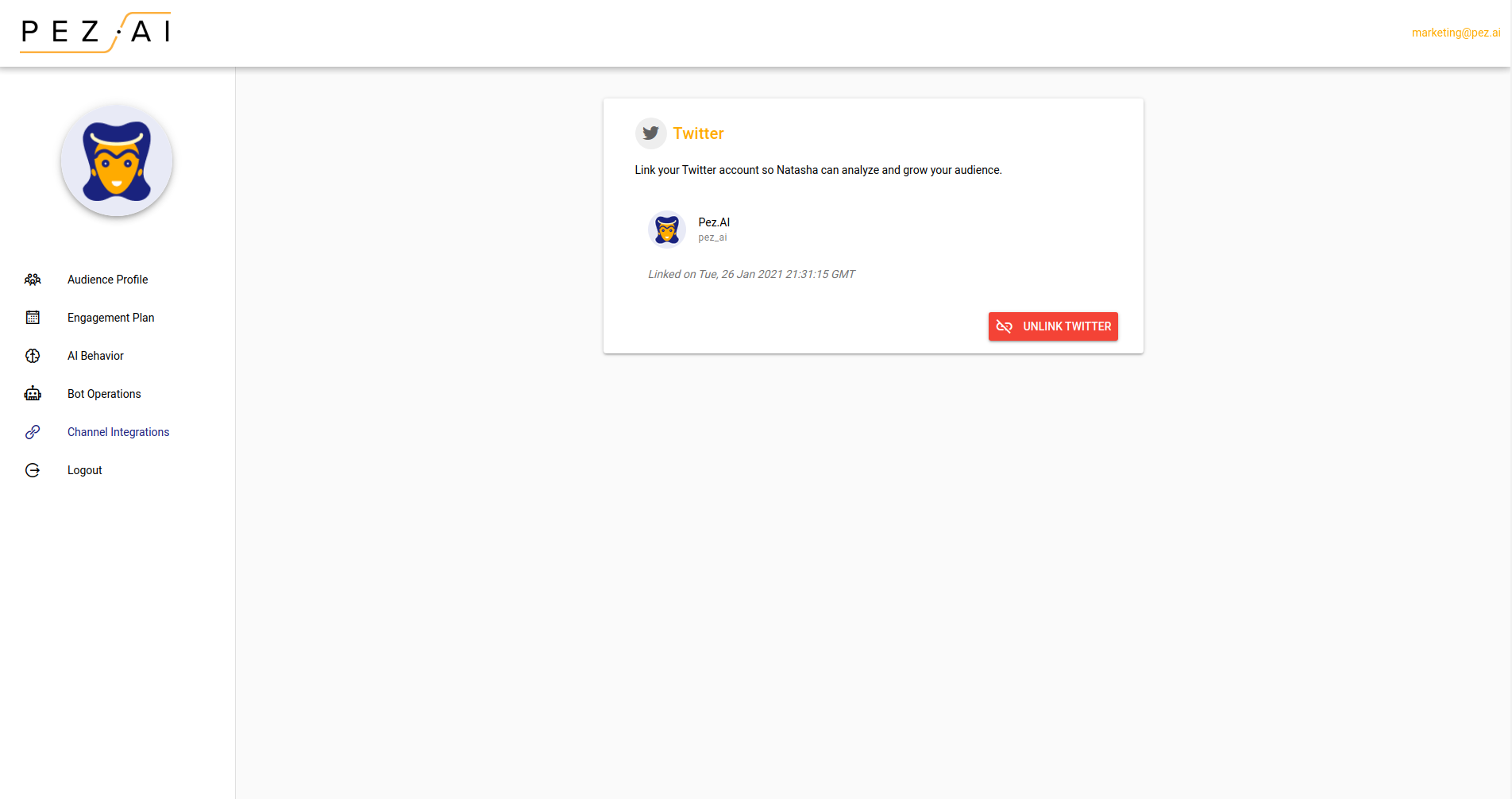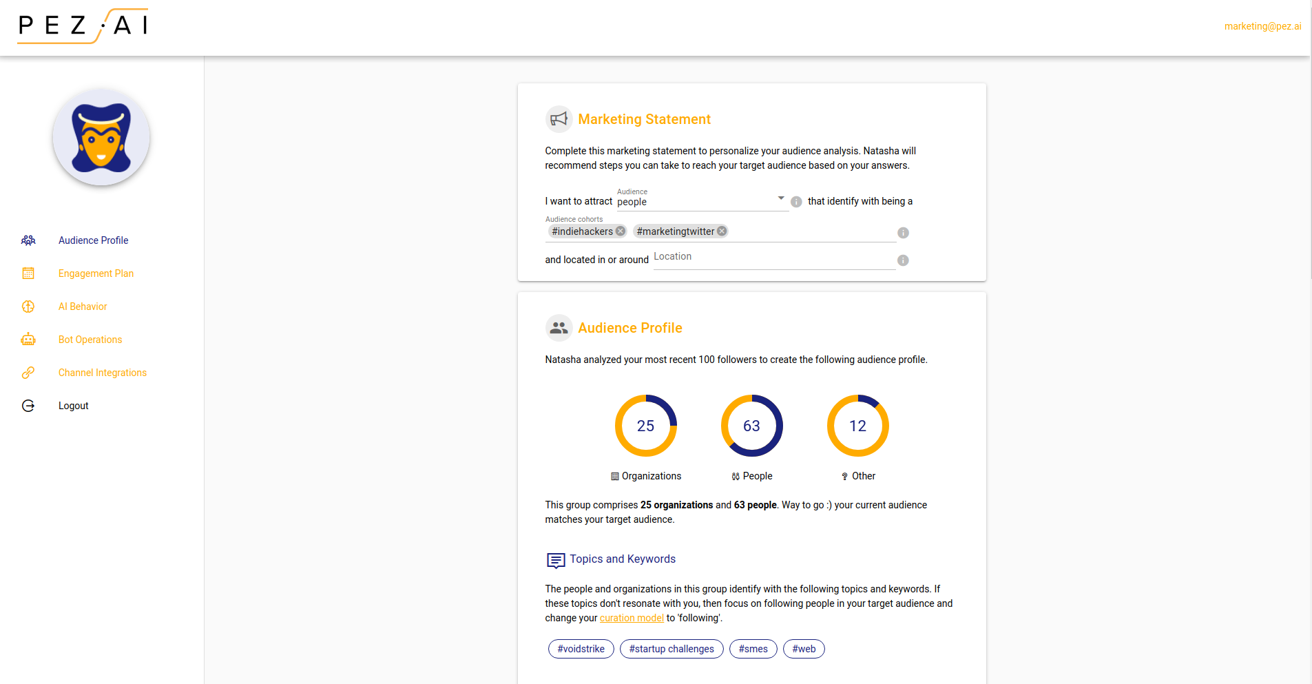 Pez.AI Natasha is an AI social media assistant that helps business owners and marketers grow their Twitter audience and fine-tune their marketing strategy. What can Natasha do for you? - Analyze your Twitter audience so you know how well it aligns with your target audience. - Increase engagement by discovering content and engaging with profiles beyond your timeline. - Engage like you would on Twitter, and with her ethical AI technology, you stay in the driver’s seat. Who will benefit from using Natasha? 1. Startup founders and small businesses that want to grow their social media presence 2. Marketers at established businesses that want to scale their social media marketing efficiently