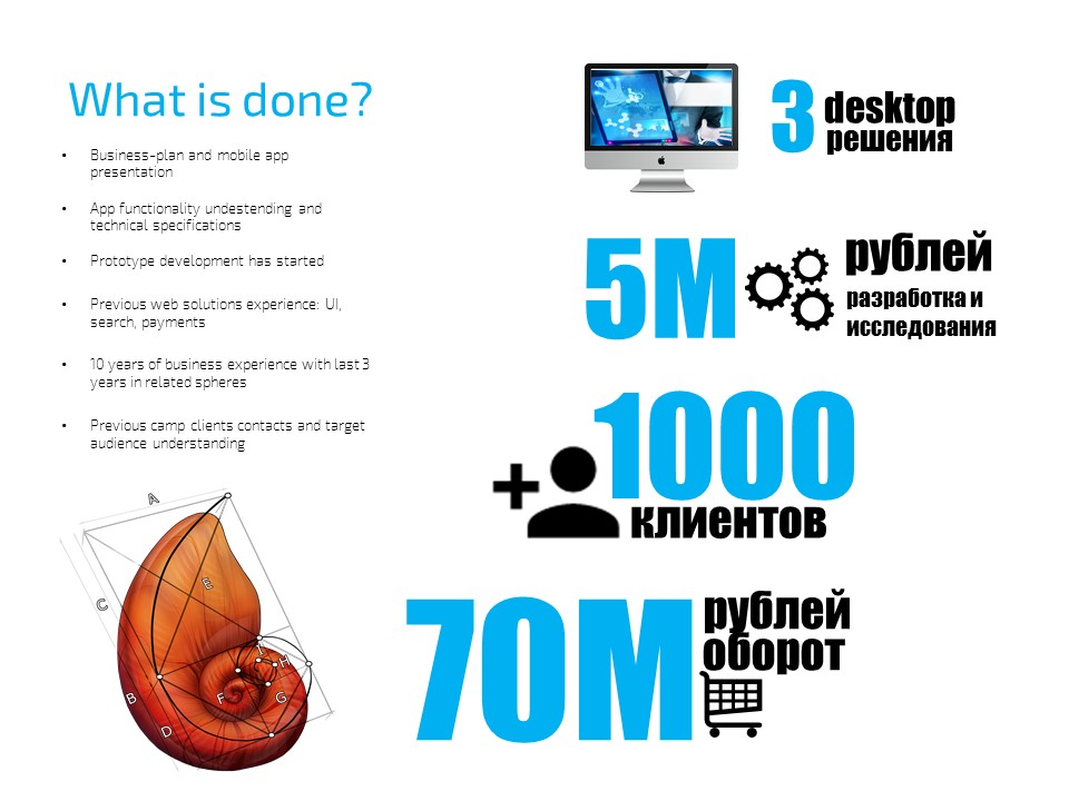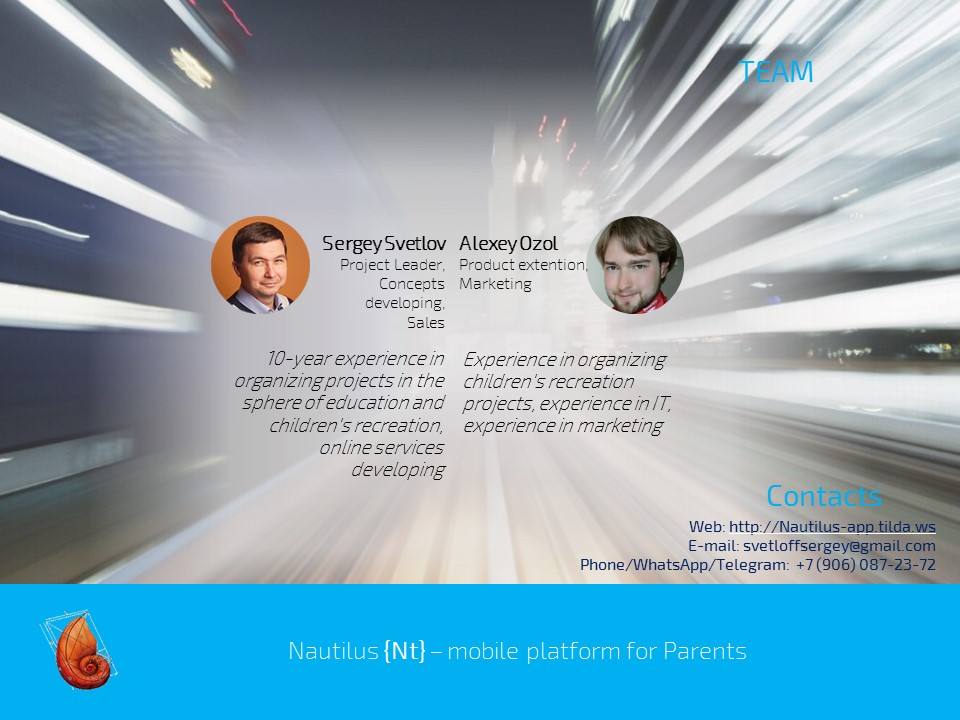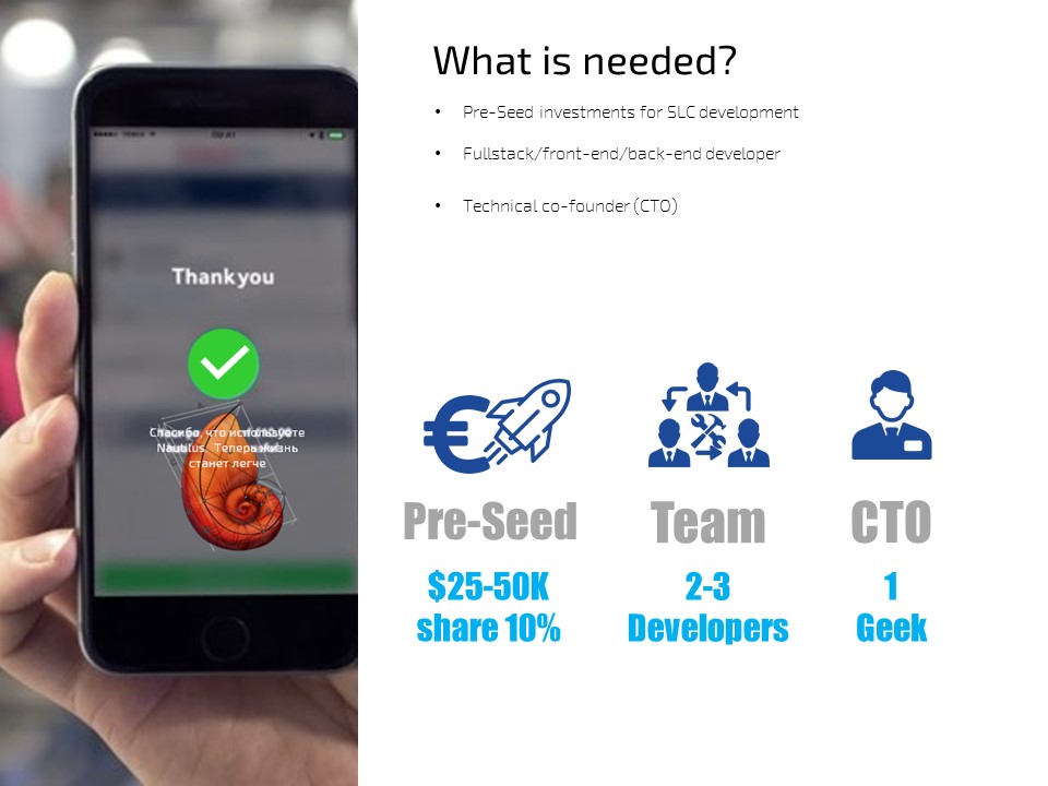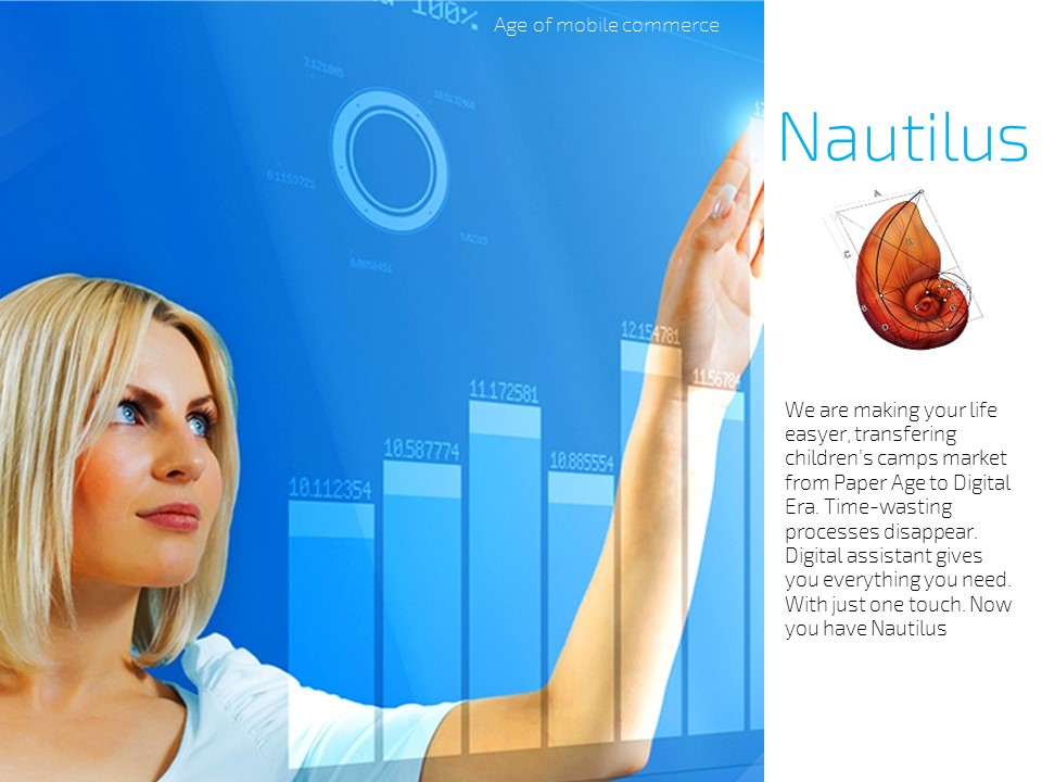We are developing a mobile application for choosing and booking children's camps. We are going to start from the Russian market as we are from Russia. There are no such applications yet and there's only one website at the market so it would be possible to get at least 10% market share in 5 years. The total market value is $1,2B and we are going to use commission model for monetization, 5% from each payment. This means that annual net profit will be $2,5M. We need $500 000 overall for SLC version development and marketing and invite you to invest $50 000 at the start of the project. We offer 10% share for the investments. If you are interested, please contact us for additional information. Pitch: Nautilus – mobile platform for parents, allowing to purchase children's services in one touch.