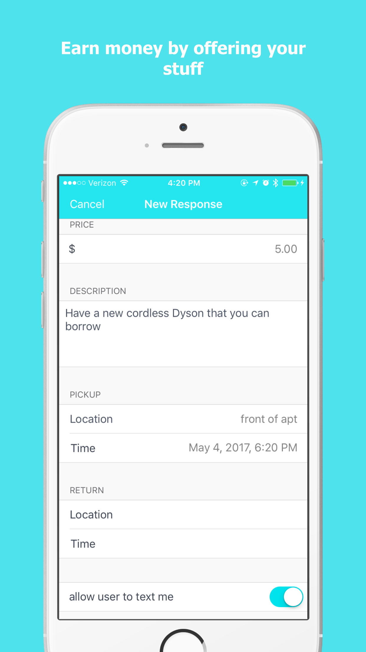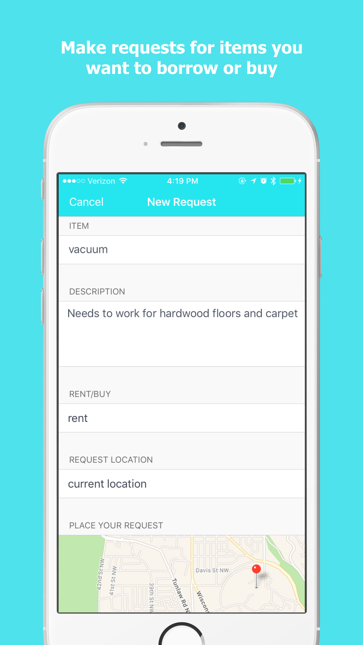 Nearby is a sharing economy app for your stuff. Ever wanted to borrow camping gear? A crock-pot? Extra chairs for the party you are hosting? Want to make money off the stuff you have sitting around? We're here to help. Download Nearby from the App Store or Google Play Store today.