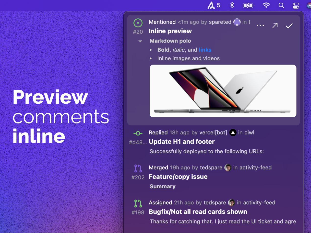 Supercharge your code review. Neat puts GitHub notifications directly in your menubar. It empowers high-performing teams to review, merge, and ship code with ease. Users can preview, triage, and jump to the browser without switching tabs. Available for free on macOS.