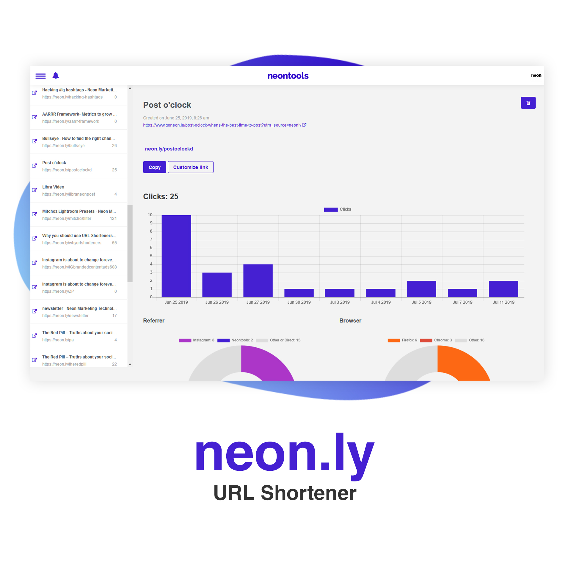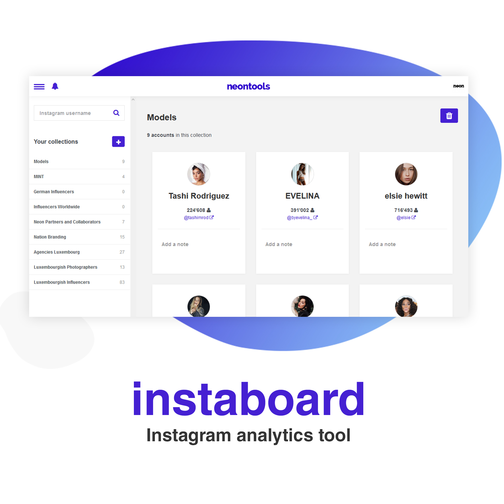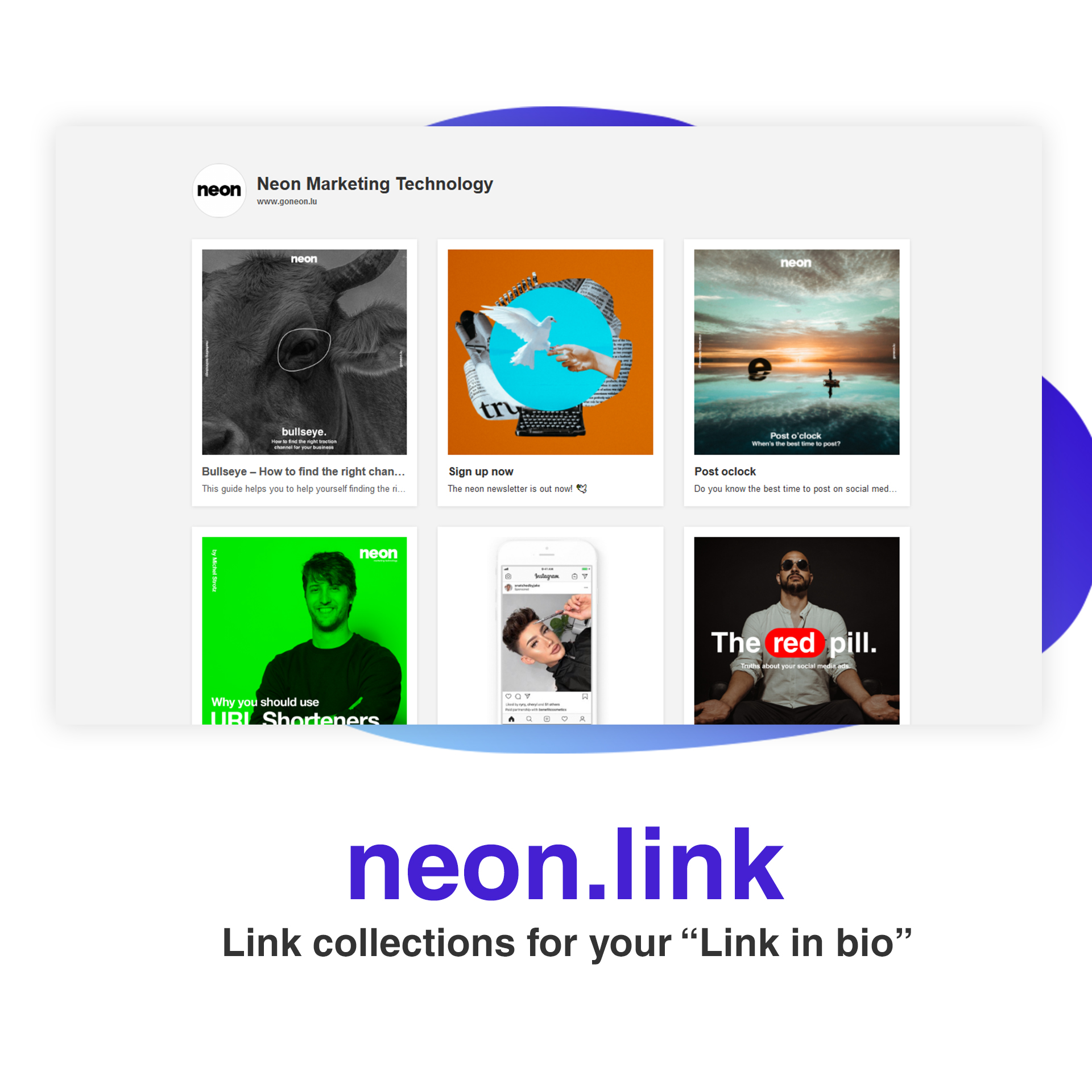 Initially designed to facilitate our own workflow and later the ones of our clients, our free toolbox brings together the essential tools every online marketer needs and combines them in one comprehensive package. The toolbox contains a total of 6 tools: • URL Shortener • Link Collections • Influencer Collections • Hashtag Analyser • ROI Calculator • UTM Generator For example: neon.link lets you easily create link collections like a sharable online blackboard, that displays multiple links on one page to use in Instagram biographies for example. Instaboard, a virtual influencer collection, allows you to save specific users into groups, track their followers and share the collection with others. For more information visit www.neontools.io or contact [email protected]