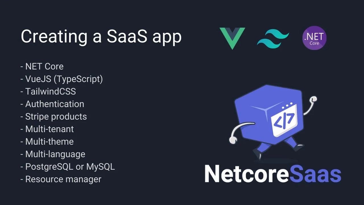The .NET Core + VueJS + TailwindCSS codebase for your SaaS project. Generate and download your project by configuring your environment variables in minutes and save hours of development time. Features: 1. Codebase starter for SaaS applications. 2. VueJS (TypeScript) frontend 3. .NET Core backend 4. TailwindCSS as CSS framework 5. Stripe: Configure your subscriptions (products and prices). 6. Multi-tenancy: Each customer has its own database (or not, you decide) 7. Multi-organization: Each tenant is an organization. Manage users and permissions. 8. Multi-theme: TailwindCSS based themes, dark and light mode. 9. Multi-language: English, Spanish and (some) Hindi language files. 10. Multi-database: Choose an EF Core supported database, PostgreSQL and MySQL. 11. Resources manager: Upload subscription or role based files for your customers.