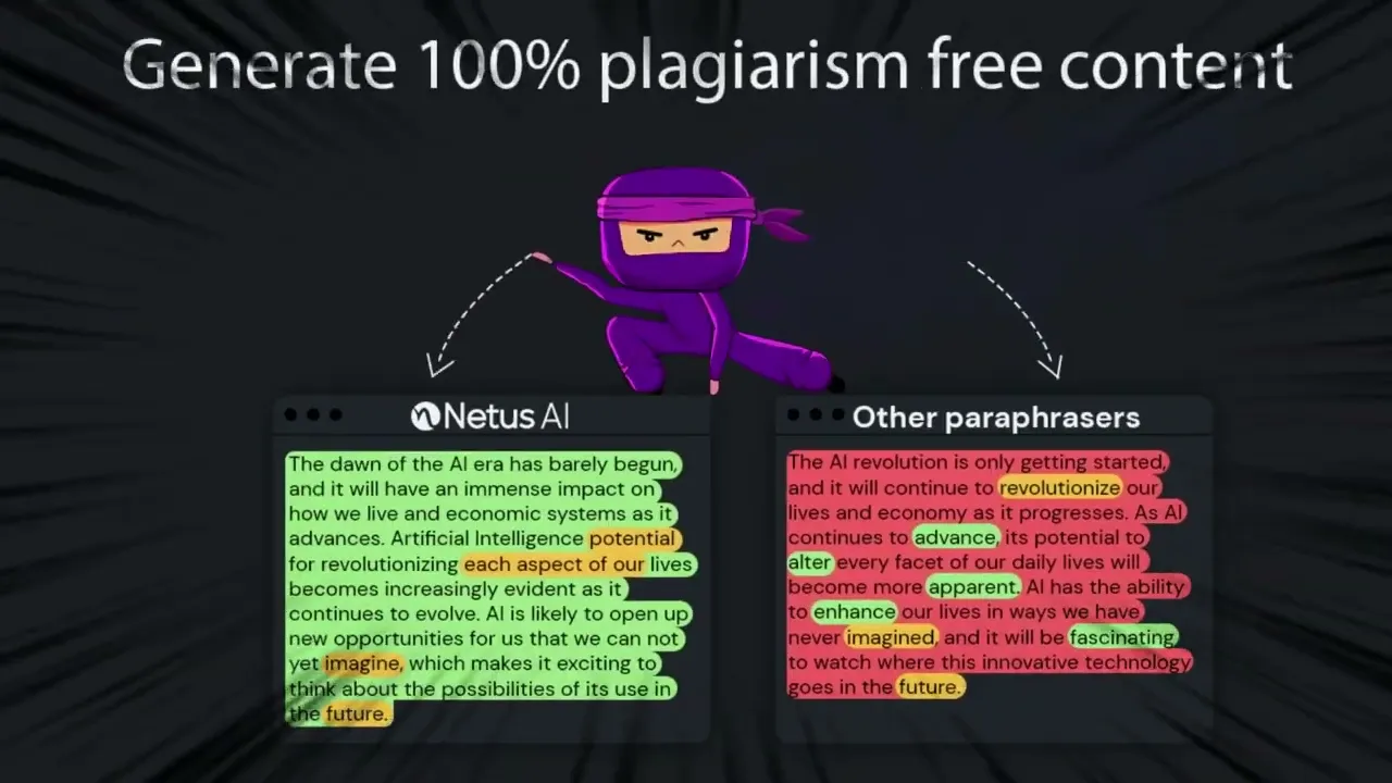 NetusAI is a powerful AI-driven technology designed to help content creators generate unique, high-quality content up to 10x faster than traditional methods. With its one-click paraphrasing and summarizing features, users can efficiently produce content while preserving the original meaning, tone, and style of writing. This suite of tools caters to a wide range of creators, including digital marketers, content writers, SEO specialists, copywriters, and bloggers. NetusAI offers an AI bypasser specifically designed to transform AI-generated content into human-like writing by adjusting NLP patterns, context, and grammar. Different AI bypasser versions are available, each tailored for various topics, ensuring a suitable solution for diverse content needs. Additionally, NetusAI features an AI detector with 99% ACCURACY in differentiating between human-written and AI-generated content, allowing users to move undetected like a ghost.