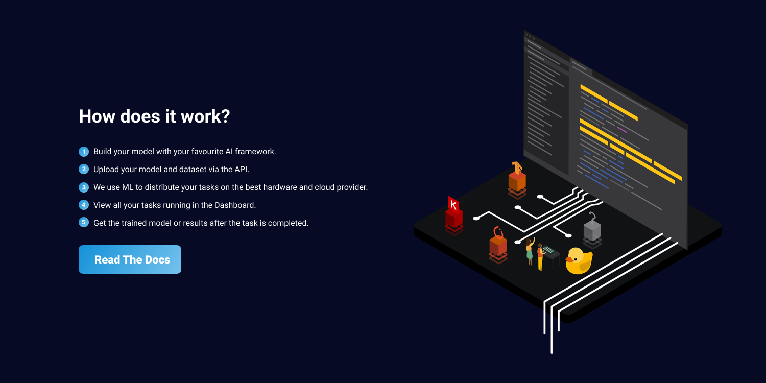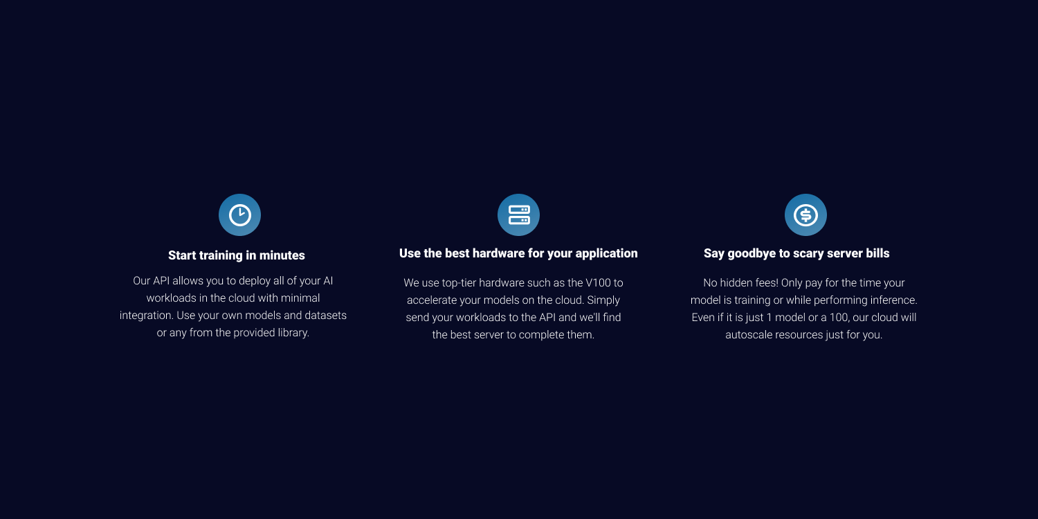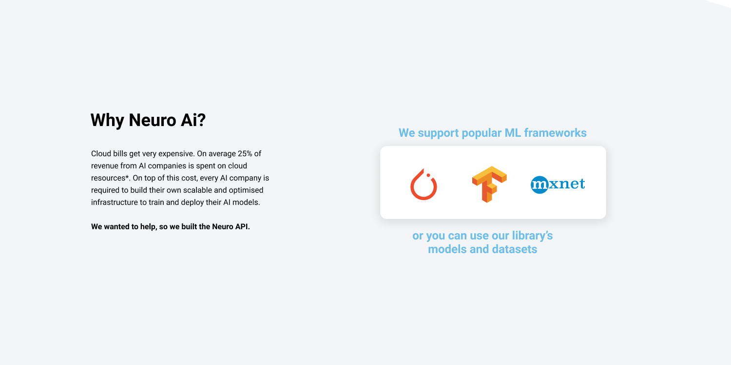 At Neuro Ai, we’re building a fast, easy to use and low cost ML compute platform which allows you to train, predict and deploy your models in the cloud in minutes. Easily upload your models using our API and only pay for the time you spend training/predicting.