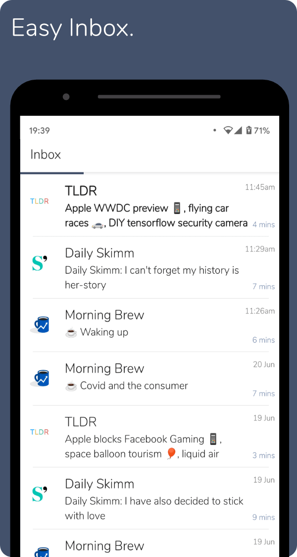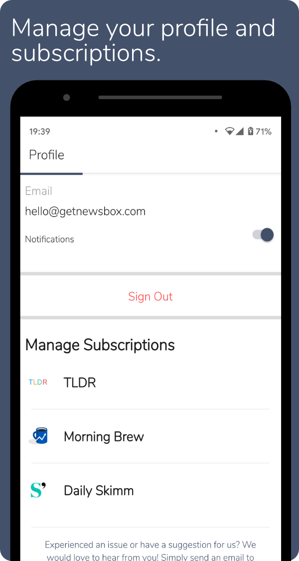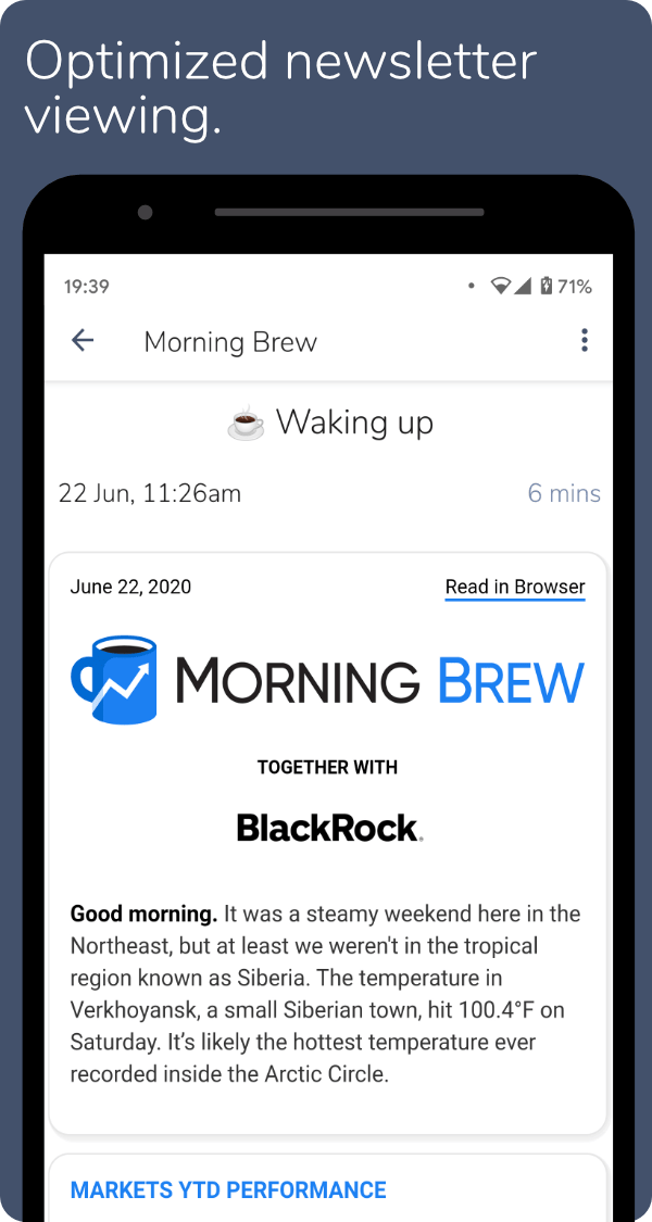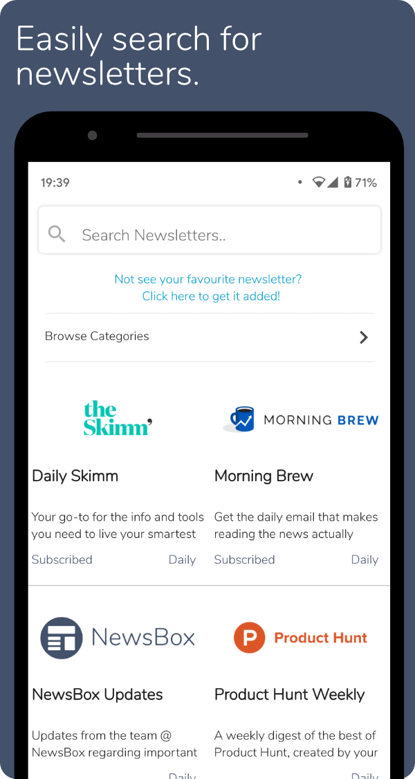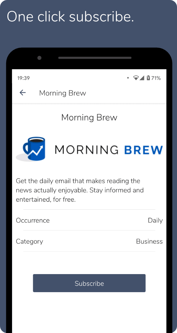 Newsbox lets you subscribe to and read newsletters, straight from the app, keeping newsletters away from your email inbox. Subscribing and unsubscribing is done with just a single click, and gives you instant access to previous issues of each newsletter, meaning you don't have to wait to start reading. You can also use the explore feature to browse categories and find newsletters you didn't know existed.
