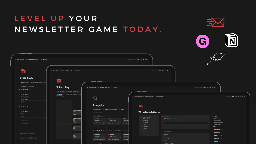 The Newsletter Wizard solves the pain of crafting, managing and organizing a newsletter with dozens of apps and gives all you need in one place: writing system, templates, analytics, and monetization tracking. I was looking for a newsletter tool like this for myself, but I couldn’t find what I need. So I sat down and spent tons of hours building it from the ground up with the help of @iampascio . The Newsletter Wizard offers an all-in-one writing experience with: - Drag and Drop writing system - Full Analytics Dashboard - Complete Monetization Tracking - Complete Newsletter Growth System - Extensive Resources Center - 339 writing prompts - 250 power words - Complete Beginner guide - 35 Niche Ideas - 14 Newsletter Tools - 10 step newsletter check list - 25 Plug & Play Emails sequences - List of 3655 templates The Newsletter Wizard also offers a full guide on how to write a newsletter also with niche ideas and curated newsletters for inspiration. All in Notion. All in one place. Who is Newsletter Wizard for? * Solopreneurs & Creators * Agencies & Email marketers * Newsletters & E-commerce brands Are you ready to feel the magic?
