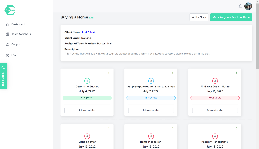 Nexsto helps real estate agents walk through the process of buying or selling a home. Real estate transactions are complex and require professional help. With Nexsto Agents create a progress plan for their clients that their clients can use to help bring transparency to the process. With Nexsto Agents can: - Shows Status of action items - Sends Due Date Reminders - Assign Tasks - Automates Follow Ups - Leave Comments - Upload Files
