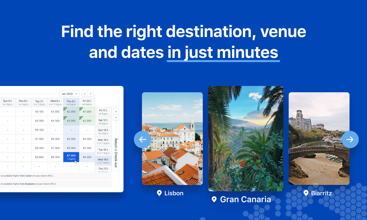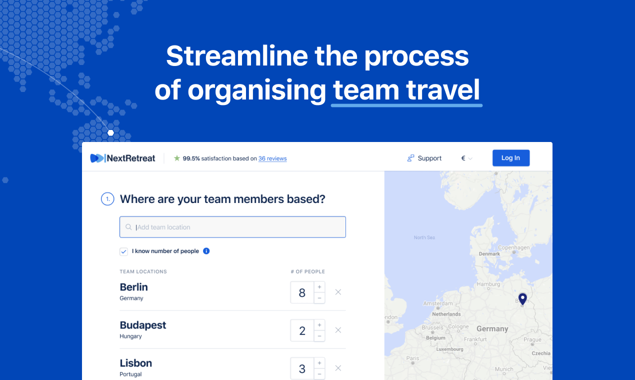 NextRetreat is the world's first all-in-one platform where team retreat & offsite organisers cut down hundreds of hours typically spent on organising, communicating and synchronising, both internally and externally. We launched on Product Hunt, please support us and upvote now! https://www.producthunt.com/posts/nextretreat-bring-your-team-together – Pick the right destination - discover the most suitable destinations to match your original work base locations. NextRetreat will find a trip destination that works for everyone, taking into account details such as the number of flight connections, average travel time and price. – Find and book the right venue for your team - Attention to detail is vital when booking a team trip. NextRetreat enables you to easily find a destination and venue designed to meet all the needs of your team. – Choose the most optimal dates – NextRetreat's Sync Calendar compares flights from your original locations and selected destination alongside other data, helping you choose the best dates for your trip.