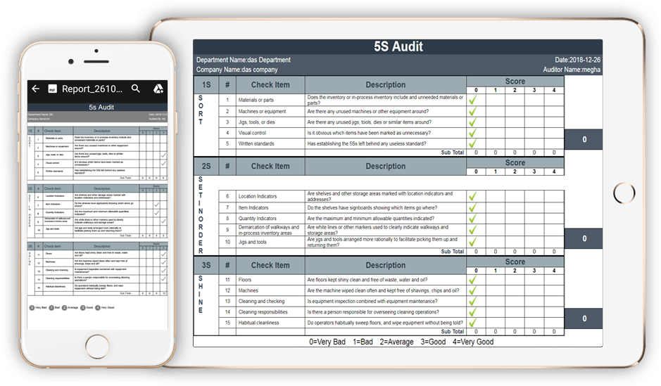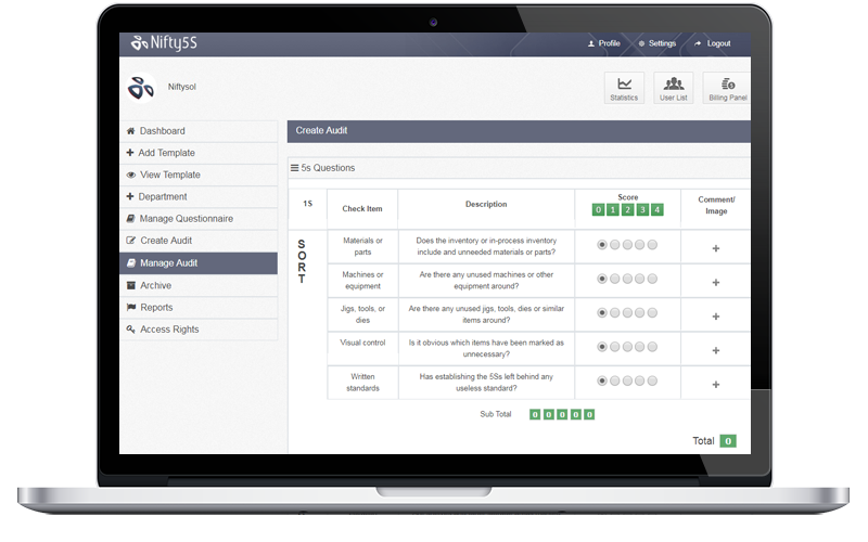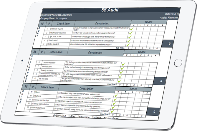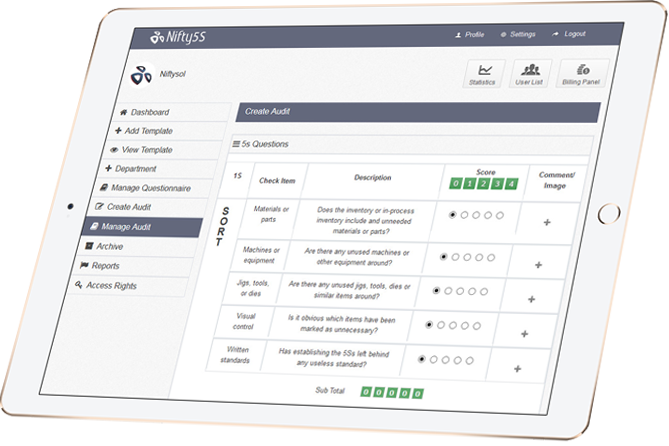 5S is one of the most important tool of lean implementation. The Nifty5s app simplifies the process of 5s audit with ready check list for each 'S': sorting, straightening, systematic cleaning, standardizing, sustaining. Start 5sAudit using mobile, tablet or web. Mobile and tablet version also works offline. Once Audit completed, synchronize it with cloud database. Generate report and share results with team members. It helps entering data directly into central database. It removes waste associated with pen & paper based audit. Different user roles like superadmin and Auditor is available to manage 5s Implmentation. Superadmin has all rights. App allows unlimited audits for multiple departments and for multiple clients. To increase productivity 5s audit templates can be created and reused for future audits. Simple 5s checklist view for ease in audit. Checklist questions can be modified. 5s Admin panel provides branding options: Logo selection, template, customized 5s questionnaire. The app also Support multiple lanaguages. Generate reports in PDF or CSV. Reports can be emailed All audit data are secured and backed up on cloud database.