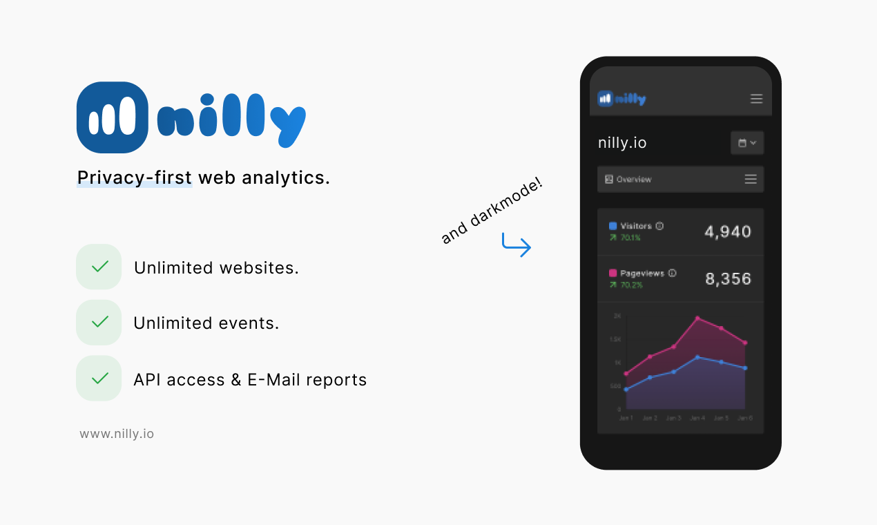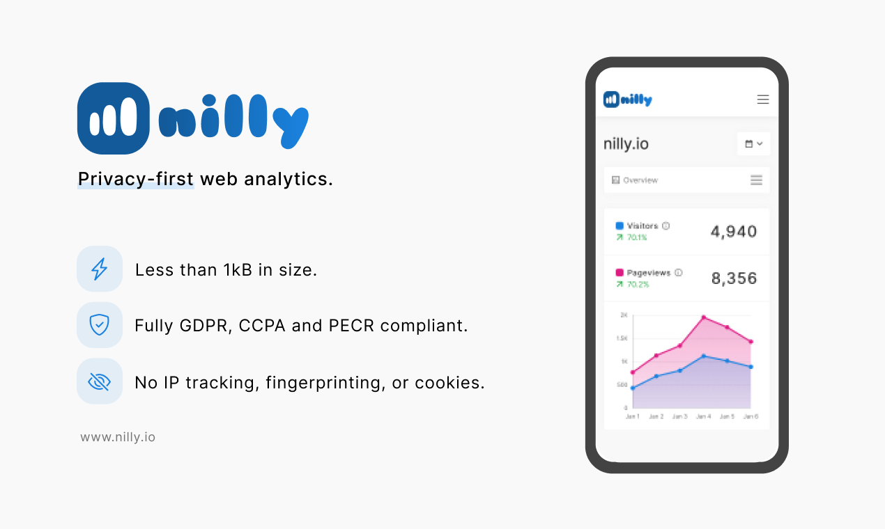 Simple and fast website analytics that belong to you. Fully GDPR & CCPA & PECR compliant. No more annoying cookie banners! Created and hosted in Switzerland ?? With nilly, you can have all the benefits from learning about your website visitors without sacrificing your and your visitors privacy. You do not have to implement any annoying cookie notices and/or consent banners and you get all the information you need in a simple yet informative dashboard.