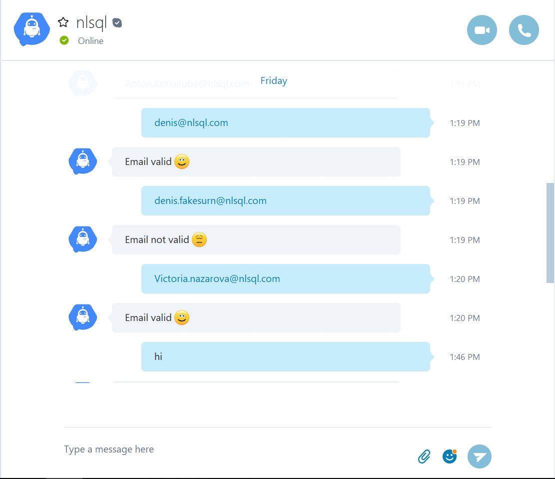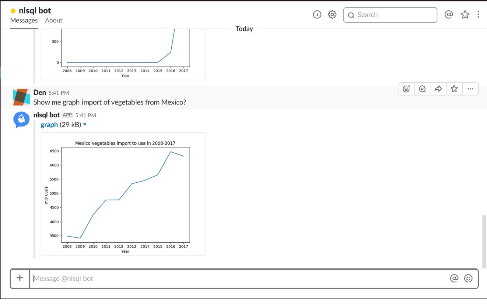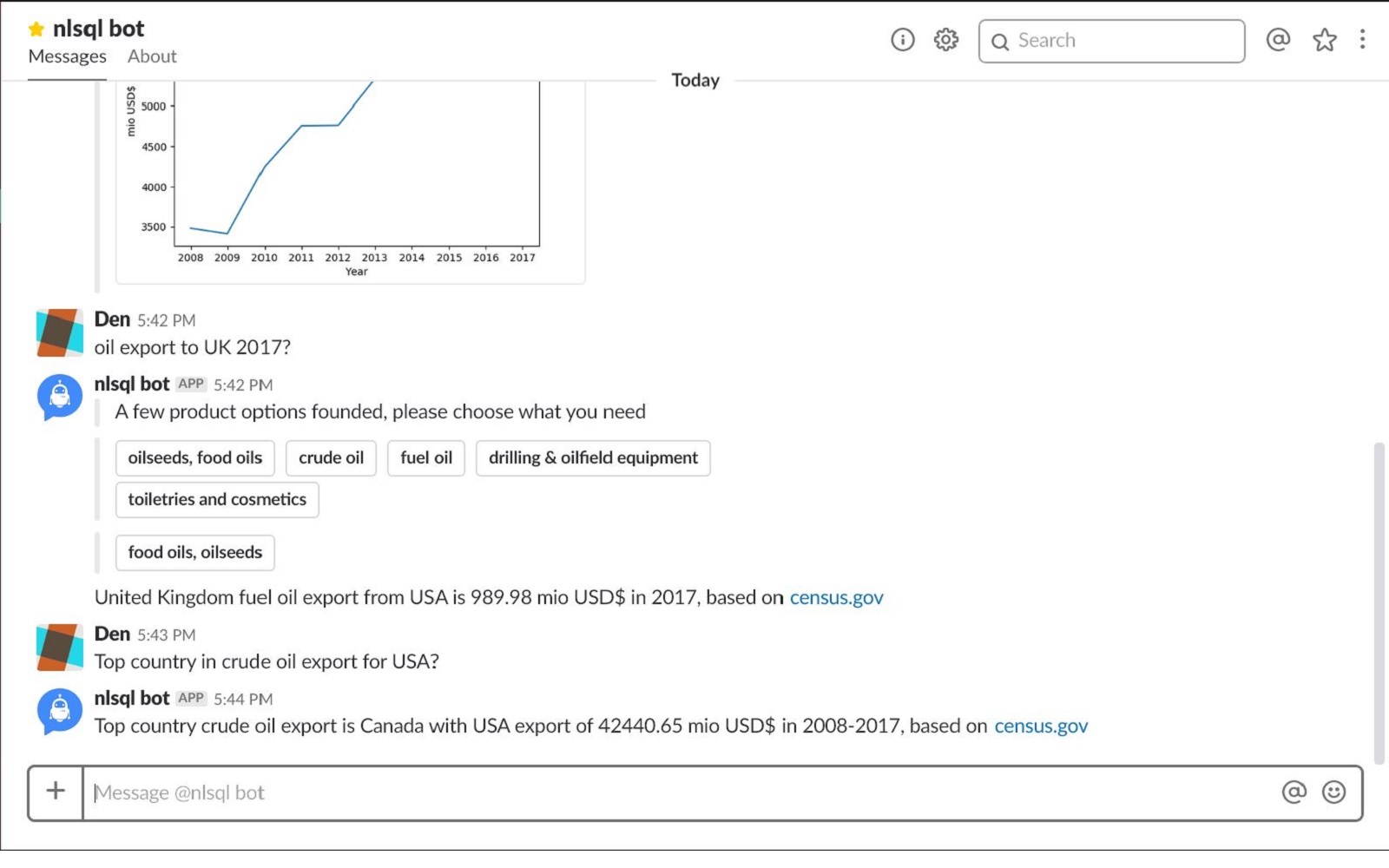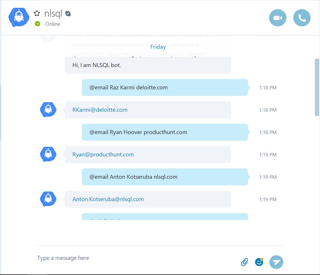 NLSQL is cognitive BI technology, which helps company employees to get information quickly and easily using only Natural Language. NLSQL technology with text AI bot interface can provide you with data analytics, business insights and data visualization. Allow anyone to easily make data-driven decisions, increasing productivity and driving businesses forward faster. Also the NLSQL Bot is able to find and verify emails, you just need to type: @email Name Surname CompanyWebsite.com or just post to NLSQL a message with email you want to verify Samples of other request: Show me graph import of vegetables from Mexico? I need graph for crude oil export to UK? What is top country in crude oil export from USA? Show me graph USA computers export? What is USA computers export is 2017? denis(ate)nlsql.com