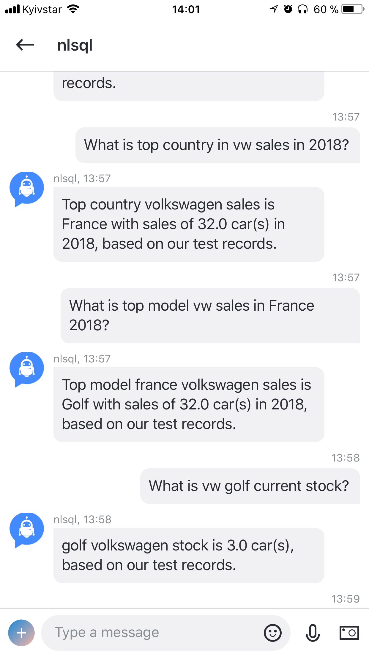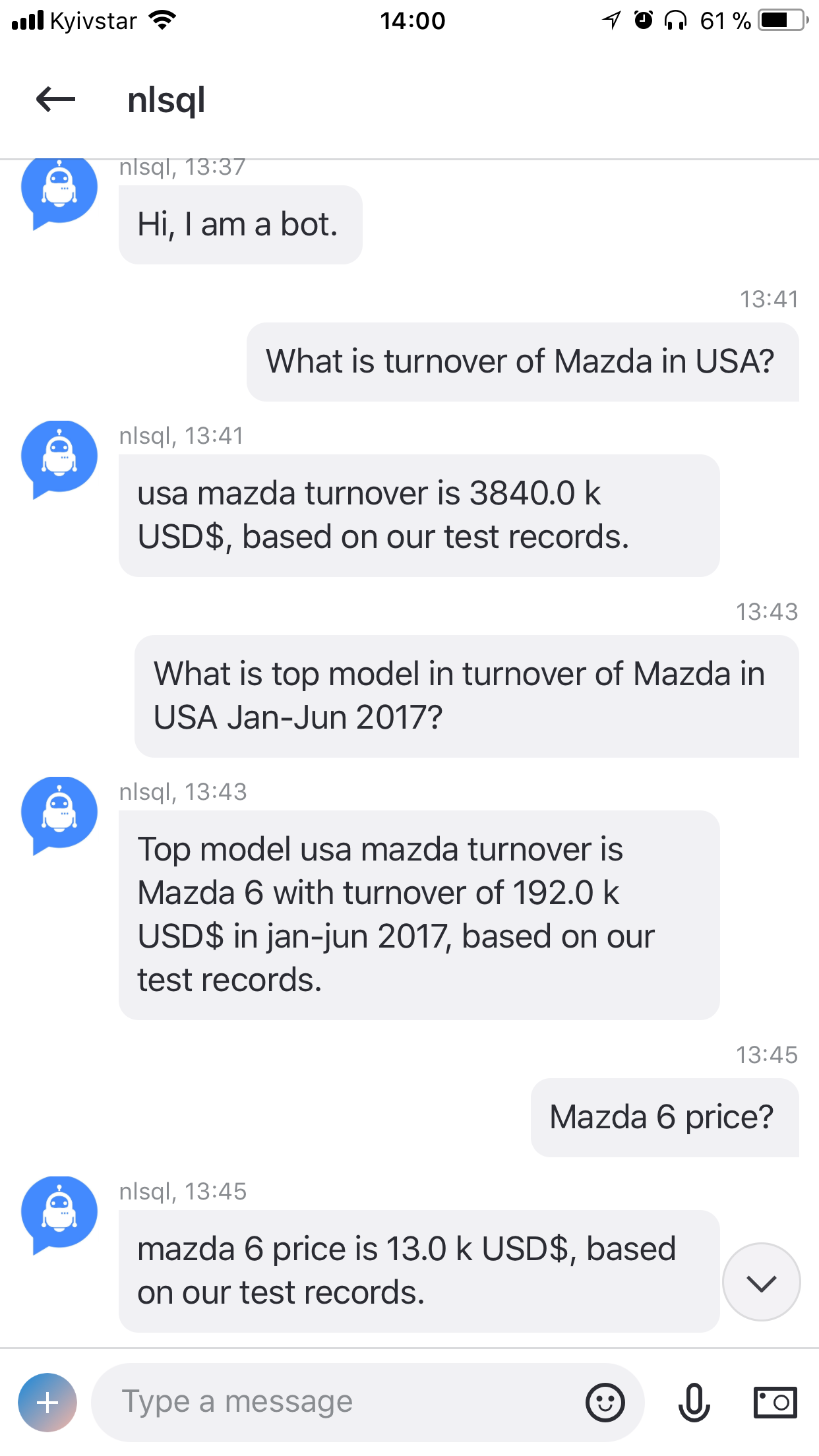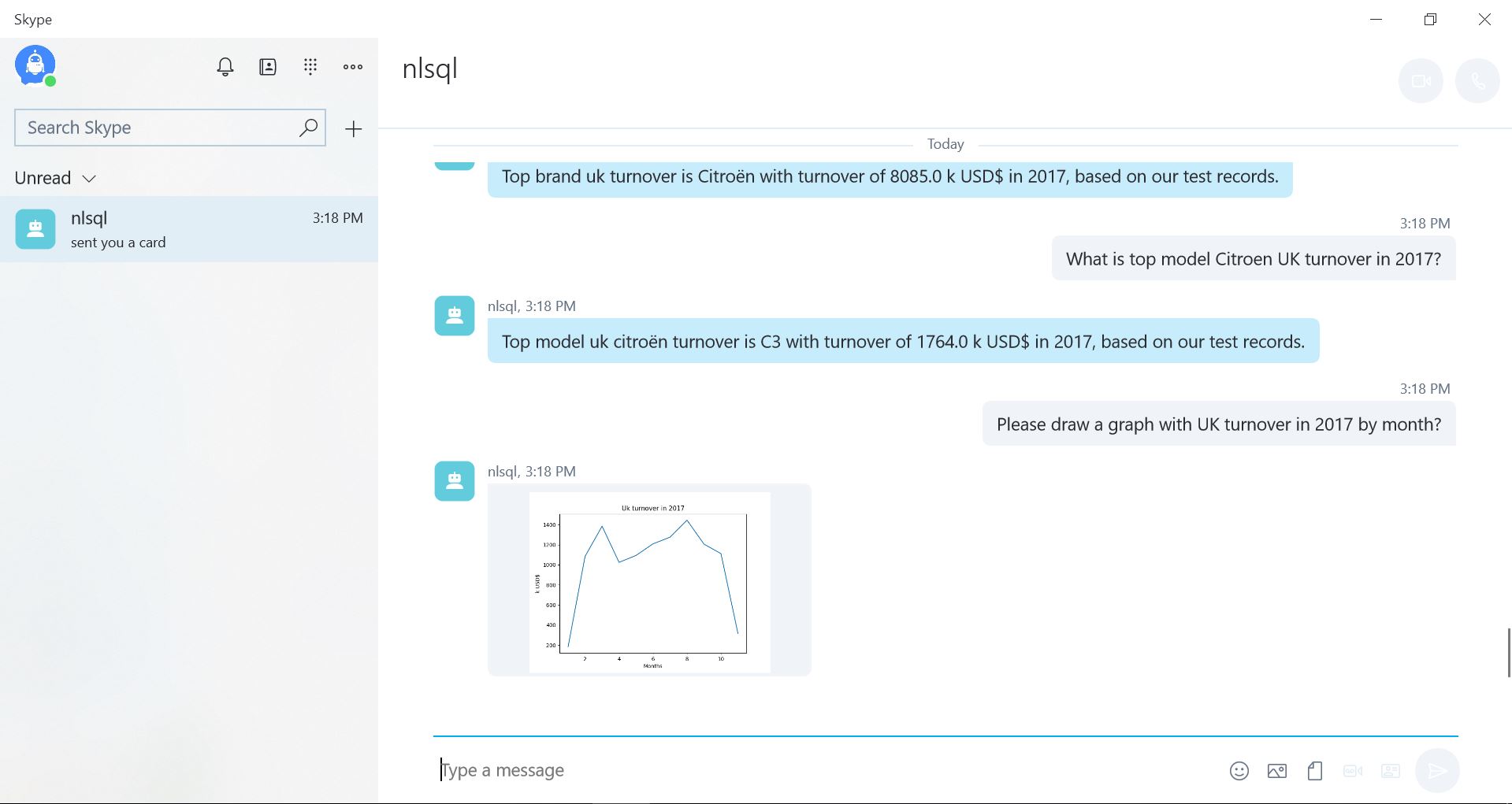 NLSQL is cognitive BI technology, which helps company employees to get information quickly and easily using only Natural Language. NLSQL technology with text AI bot interface can provide you with data analytics, business insights and data visualization. Allow anyone to easily make data-driven decisions, increasing productivity and driving businesses forward faster. Also the NLSQL Bot is able to find and verify emails, you just need to type: @email Name Surname CompanyWebsite.com or just post to NLSQL a message with email you want to verify Samples of other request: Show me graph import of vegetables from Mexico? I need graph for crude oil export to UK? What is top country in crude oil export from USA? Show me graph USA computers export? What is USA computers export is 2017? denis(ate)nlsql.com