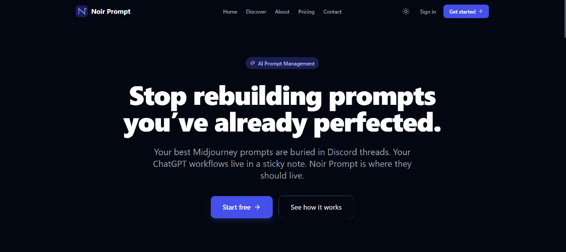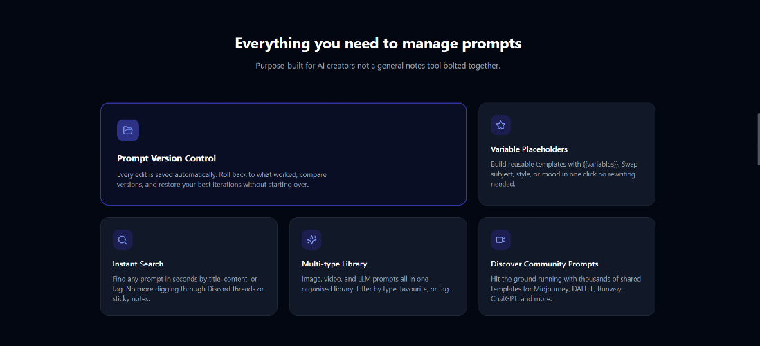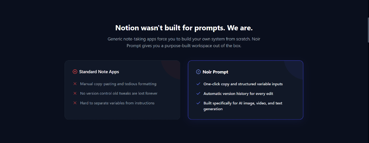 Noir Prompt is a dedicated prompt library for creators. If you use Midjourney, DALL-E, Stable Diffusion, ChatGPT, Runway, or any other AI generation tool this is where your prompts live. Who It's For AI image creators who spend hours refining Midjourney and DALL-E prompts and can't afford to lose them Video creators working with Runway, Pika, or Sora who need to track what's working across generations ChatGPT power users who have built effective system prompts and workflows they reuse daily Prompt engineers who treat prompts as a serious craft and need version control to match Content creators and marketers who rely on AI tools for daily output and need a repeatable system Founders and product owners who use AI tools to produce content, build marketing copy, and generate assets and need a repeatable system that scales with their workflow Solo builders and indie hackers who wear every hat and can't afford to waste time recreating prompts they've already perfected Core Features Prompt Library - Store all your image, video, and text generation prompts in one clean, searchable place Instant Search - Find any prompt in seconds by title, content, or tag Version History & Diff - Every edit is saved automatically. See exactly what changed between versions and roll back to any previous iteration Variable Placeholders - Build reusable templates with {{subject}}, {{style}}, {{mood}} and swap values on the fly Type & Tag Filters - Filter prompts by image, video, or text generation type so your library stays organized Collections - Group prompts by project, client, or style Import - Bulk import prompts from .txt or .md files with smart split modes and preview before importing Export - Export your entire prompt library so your data is always yours Template Library - Community built ready to use prompt templates for Midjourney, DALL-E, ChatGPT, Runway, and more Coming Soon AI Prompt Tools - Reverse-engineer prompts from images, enhance weak prompts, and generate variations in one click Integrations - Connect directly with your favorite AI tools Browser Extension Why Noir Prompt There are Notion templates, browser extensions, and LLMOps platforms. but nothing built specifically for the creators. Noir Prompt is the first dedicated prompt manager covering image, video, and text generation in one place 👉 noirprompt.com