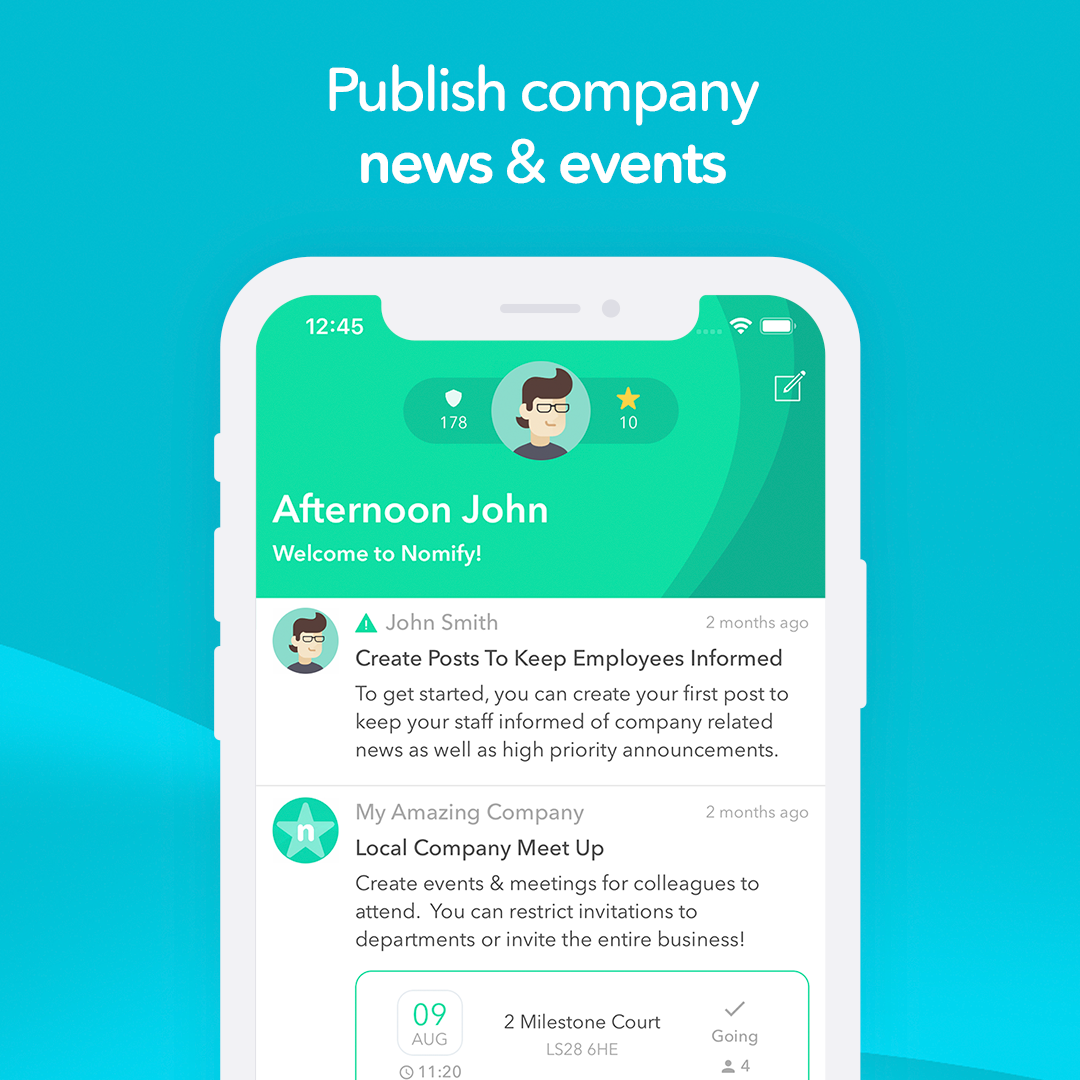 Nomify lets you recognize staff, issue documents, post news & events and manage staff holidays.