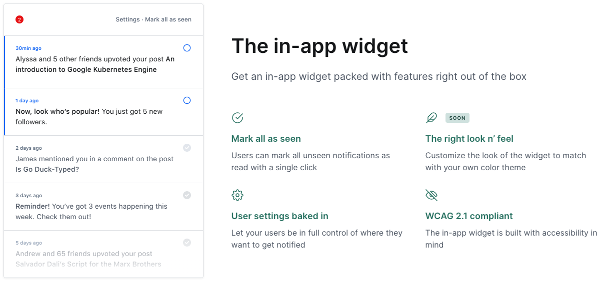 Notifly is a simple way to manage in-app and email notifications for your web app. When we talk about notifications, we mean transactional stuff (not marketing). Think notifications like you find in the top right corner of Facebook ("Jamie replied to your post", "You have a new friend request", etc). What is cool about Notifly, is that: * We have built a nice functional widget that you can plug in to your app in minutes. * We will take care of sending the emails for you, so you don't need to set up a separate email service, and you don't need to worry about deliverability. * Bundling! Instead of sending your users 10 notifications with "You got a like", we will make sure they get one saying "You got 10 likes" instead. * Smart delivery. If you use Notifly for both in-app and email notifications, then we make sure that you don't need to notifly people on email if they already saw the notification in-app. * Let your non-tech people help out with editing copy using our web-app. This allows everyone to change and improve copy for all notifications without requiring a developer to help out.