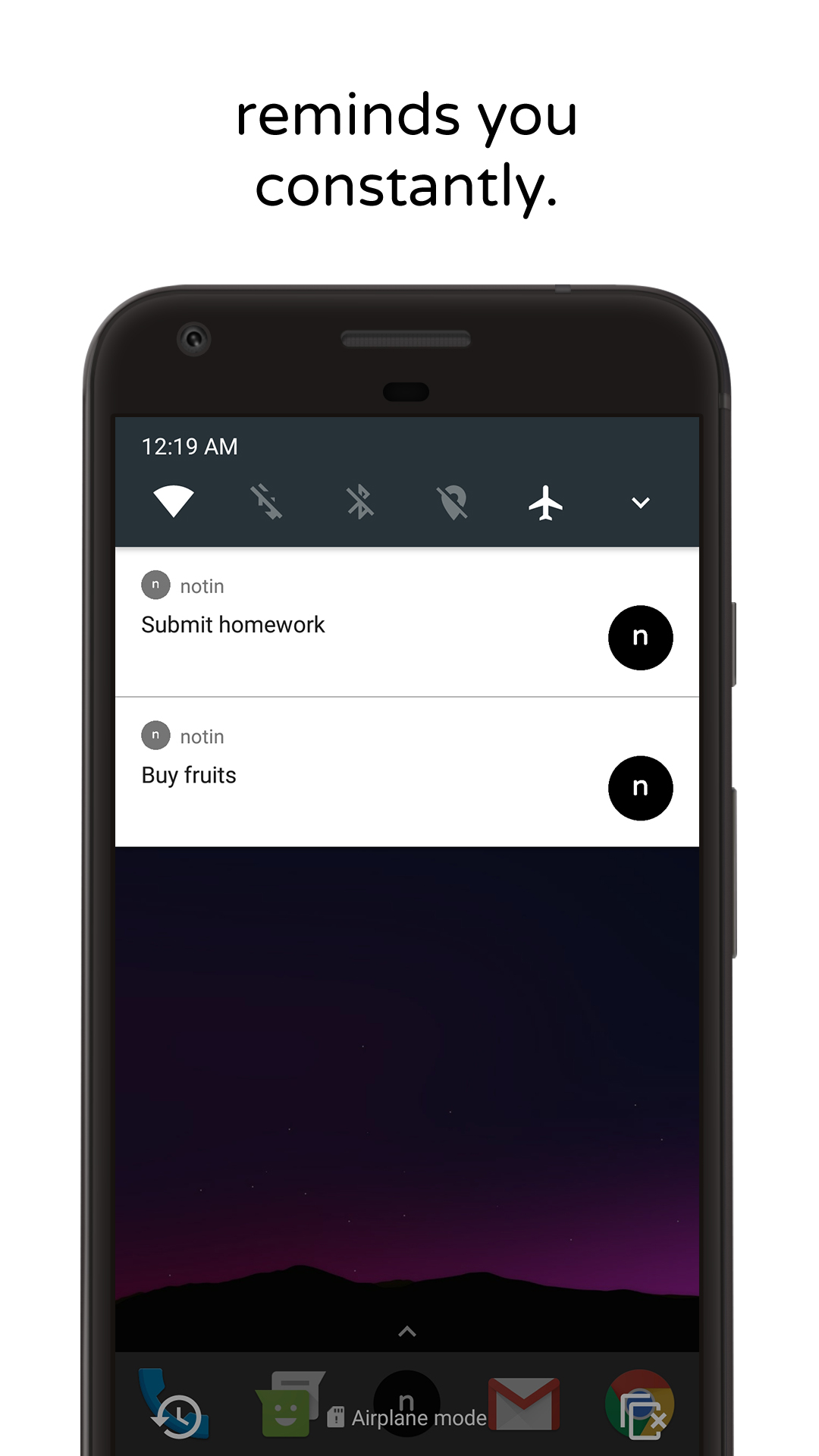 With notin, never forget the little things anymore. It's an easy way to save notes or reminders as a notification. notin helps you in reminding things you need to do, random numbers you do not want to save in your contacts and many more through the help of Notifications. The reminder doesn't pop-up or rings, it just sits there and still does it's job most efficiently. Features • Save what you need, fast • Be constantly reminded • Beautifully designed • Easy to use interface • No unnecessary or complex features