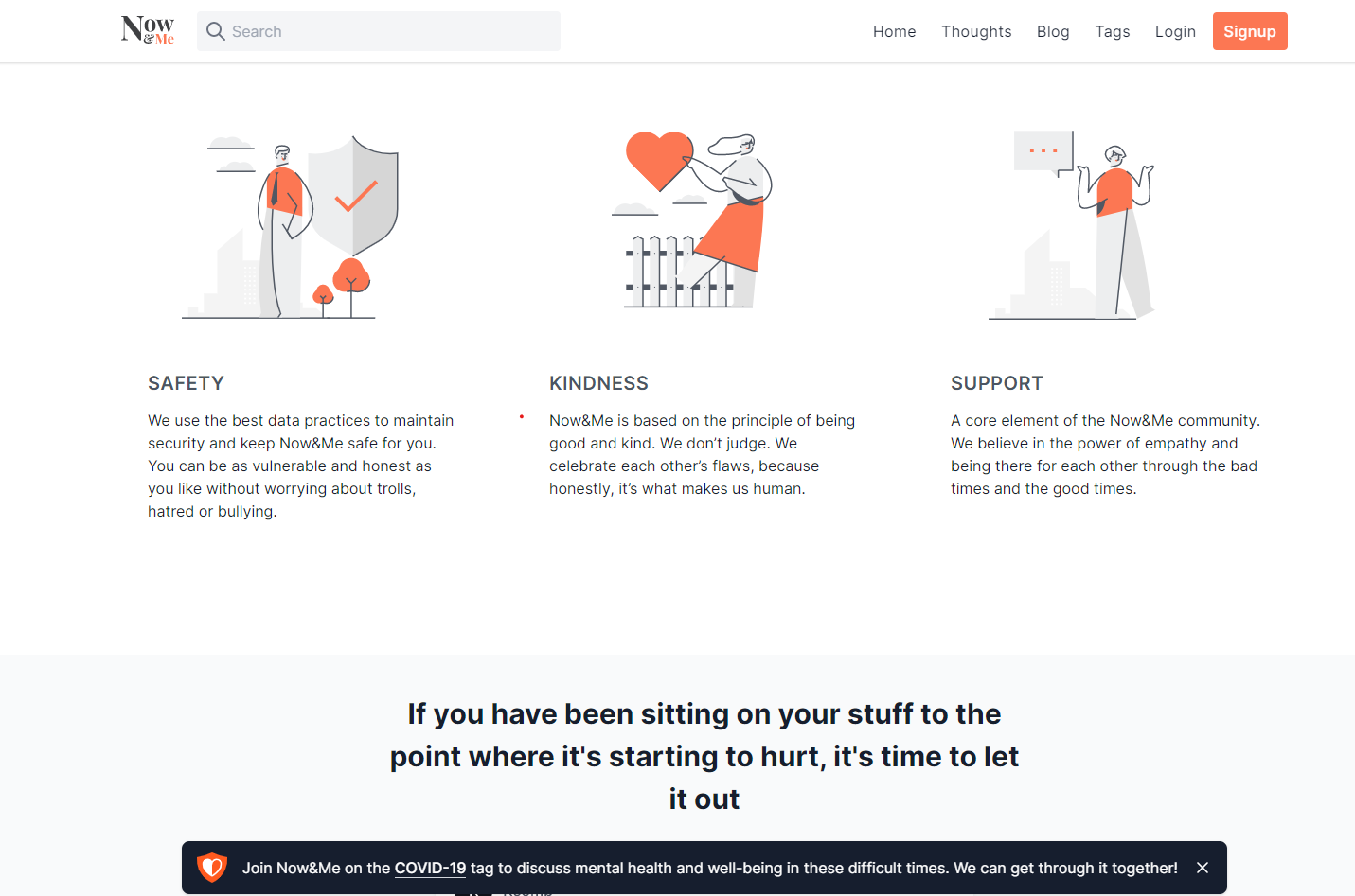 Now&Me is an up and coming platform to interact with people across the world over shared thoughts and feelings. We encourage people to let down their guard and pour their hearts out. The users have the option of doing so anonymously as well. Our users experience the feeling of feeling better, on Now&Me. Life is messy, awkward, clumsy, embarrassing & Now&Me is here for all of it!