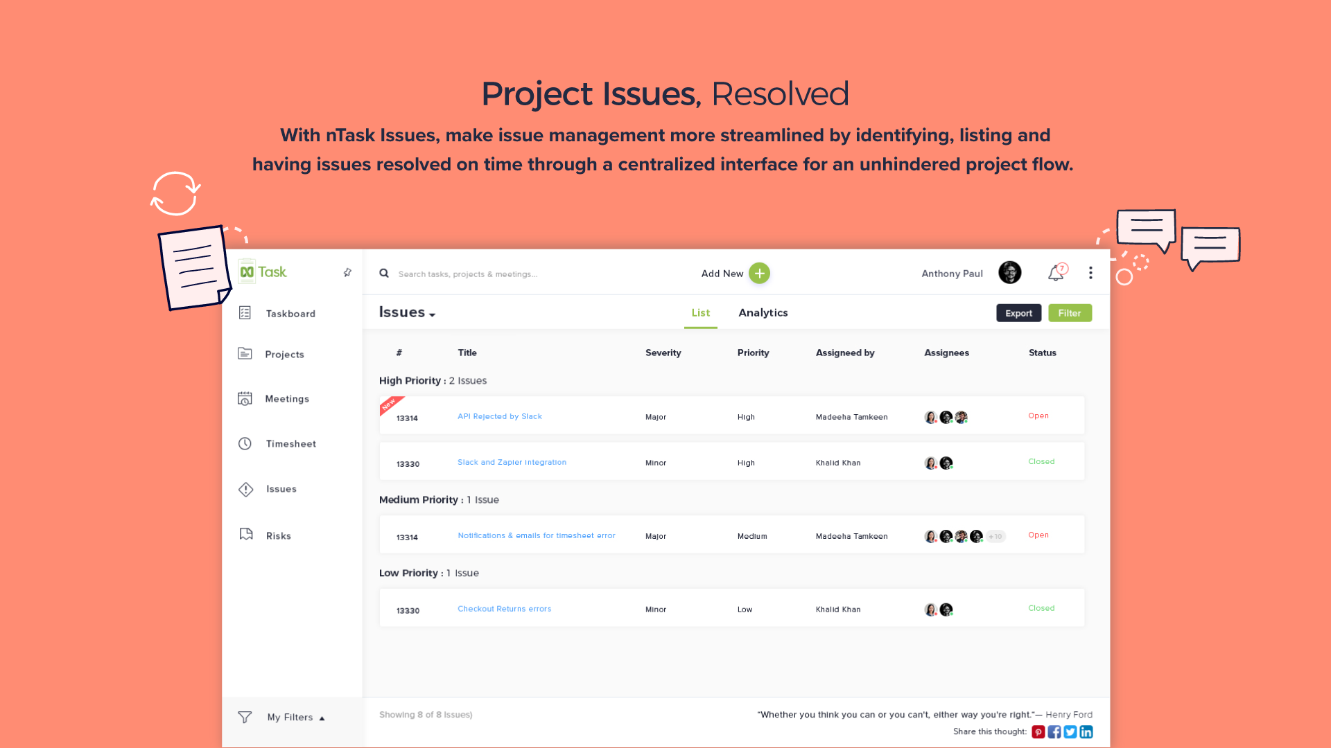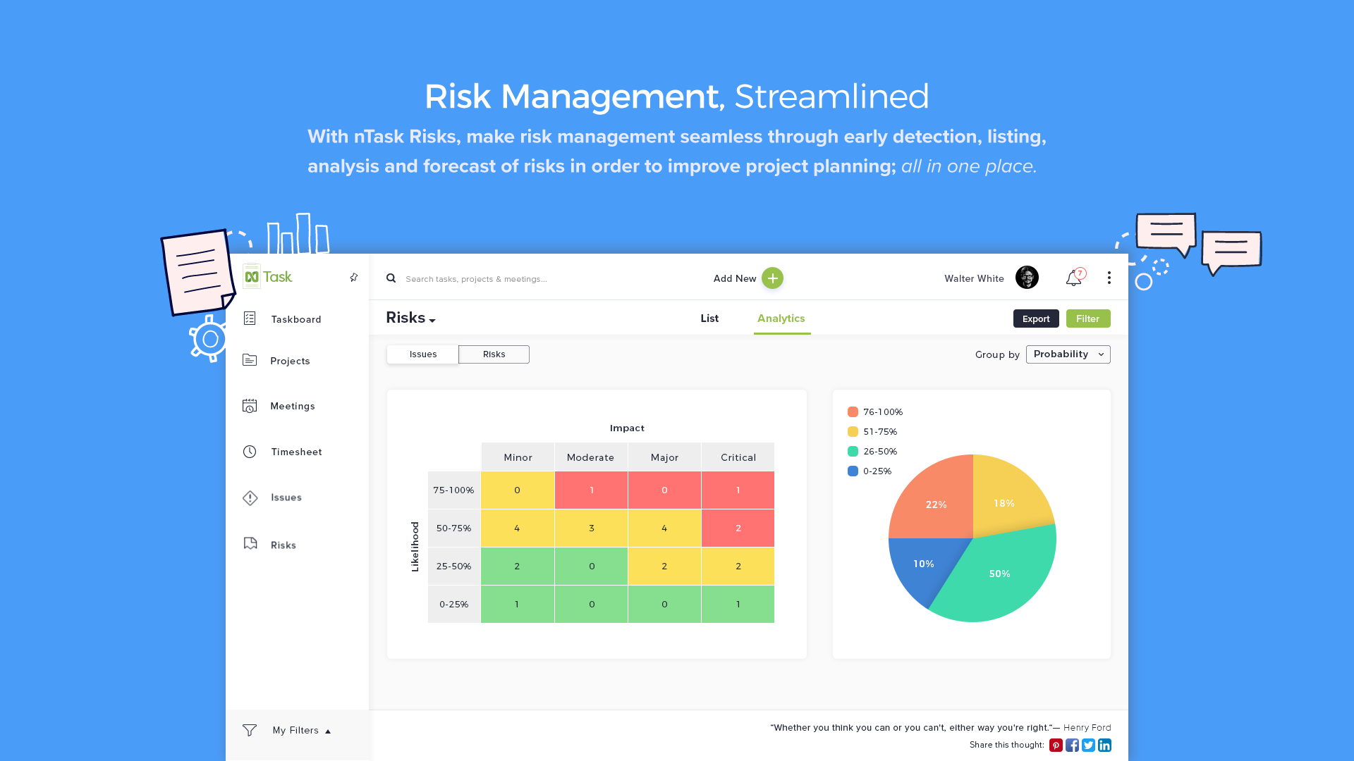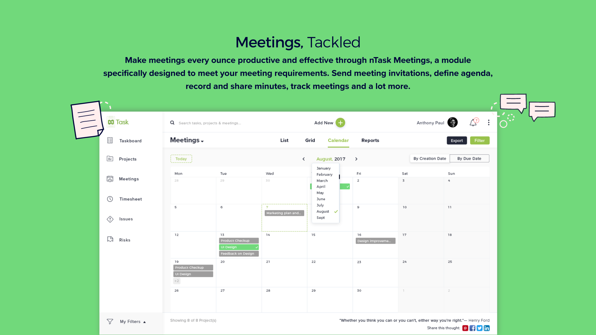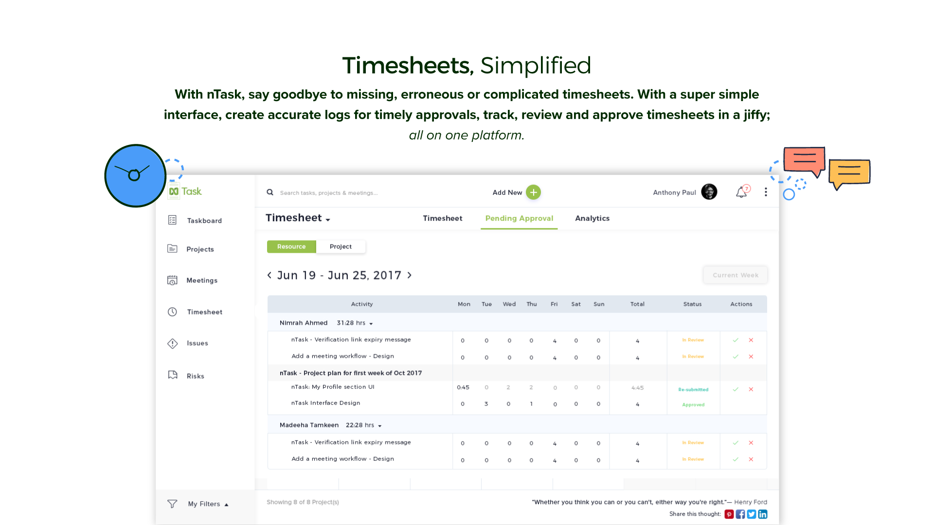 nTask is a free online project management platform used by teams and professionals. With nTask, making checklists, managing projects, collaborating with project teams, scheduling meetings and more becomes easier than ever. What makes nTask stand out is that it brings together all the tools needed for small and large teams to collaborate on different projects. Built for Agile teams, nTask lets you create and assign tasks for you and your team, submit and receive daily timesheets and more. It also comes with advanced meeting management, letting you create meetings and invite people directly through their email, jot down key meeting decisions and minutes and circulate them later for review. nTask also offers Risk and Issue tracking for projects - now teams can document all risks and issues and associate their details to keep everyone up-to-date. Signing up for nTask is easy and free. Start collaborating today!