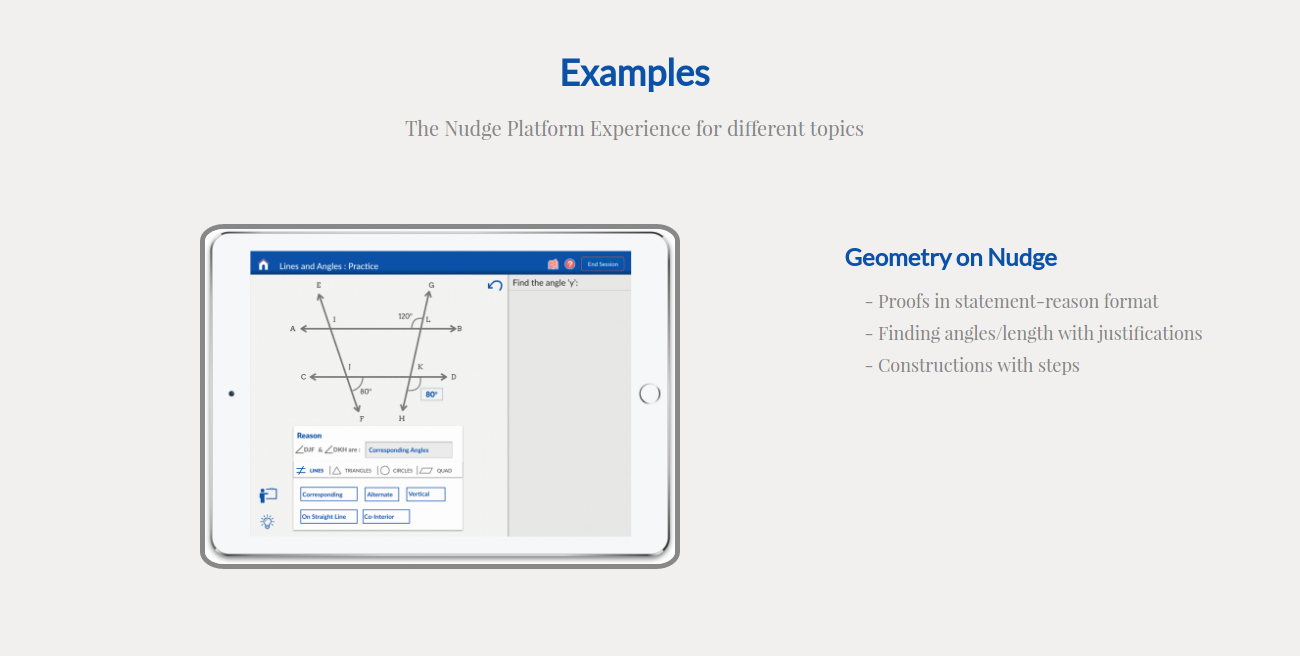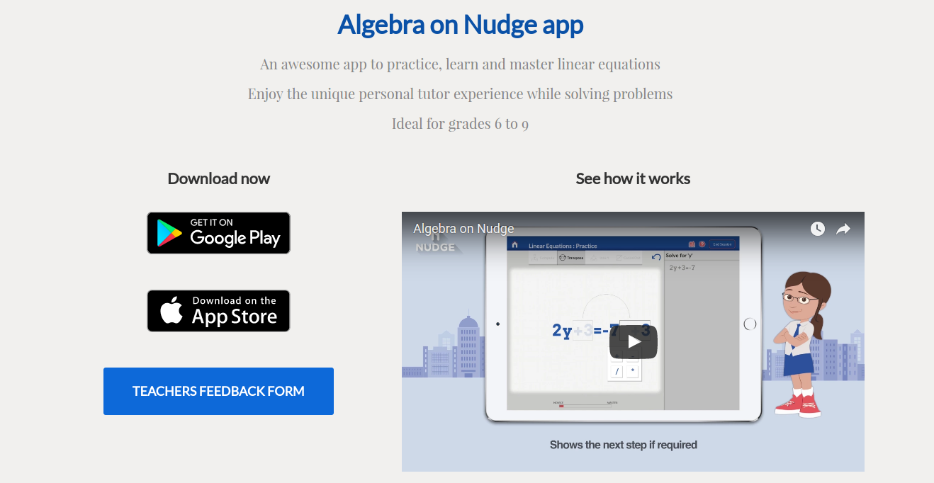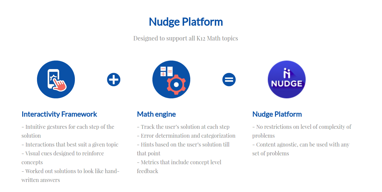 Welcome To Nudge The most advanced math practice platform for K12 students - Simple gestures to solve step-by-step as you would on paper - Sensory learning experience with touch and visual cues - Help at hand with hints when you are stuck - Instant feeback when you go wrong - Problem set specially tailored for you - Detailed reports with concept level ratings