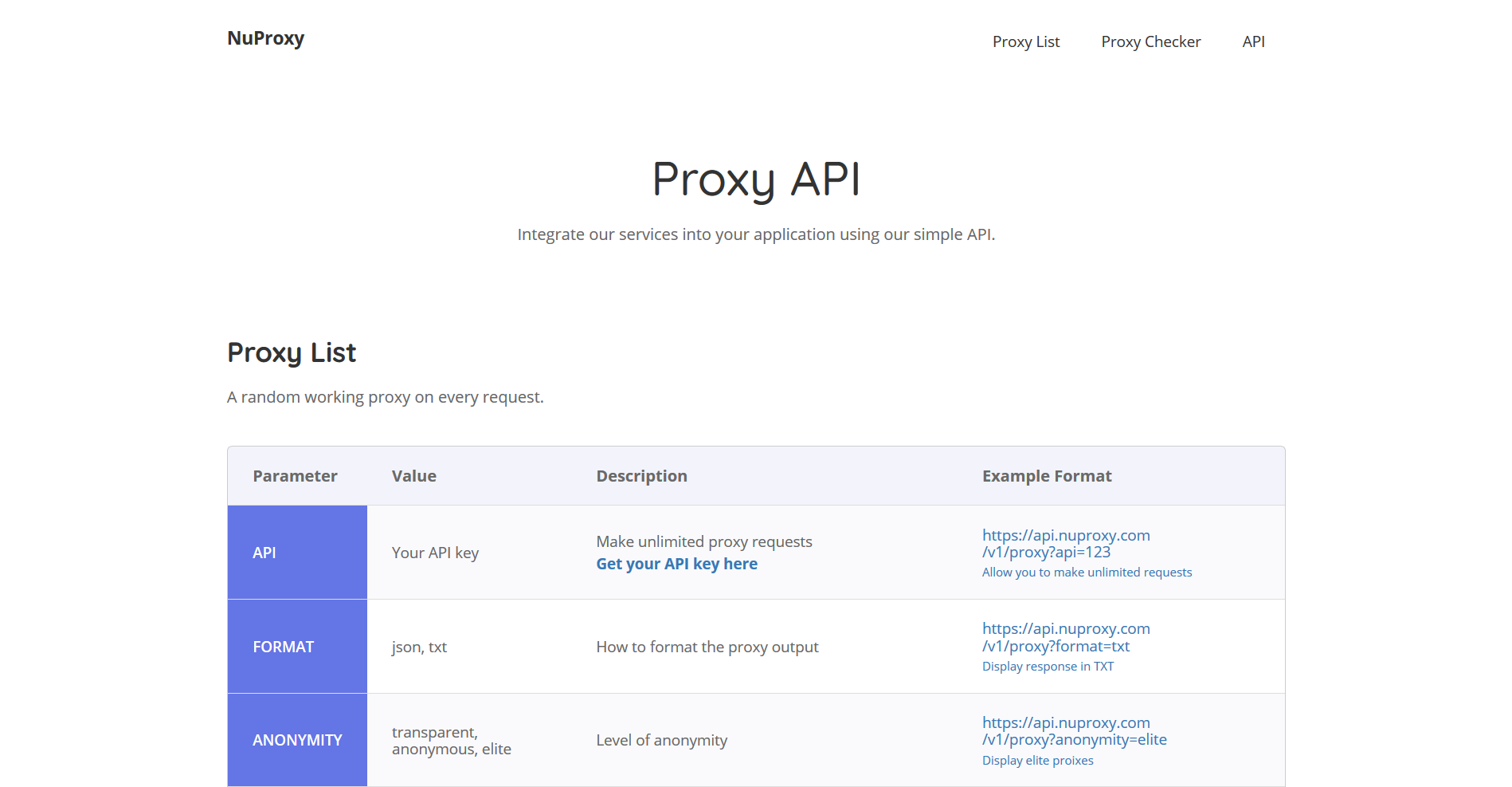 NuProxy is a free proxy list and proxy checker. Our bots crawl a numerous amount of sites for proxies and make sure they work before we present them to our users. All of our features are available via an API.