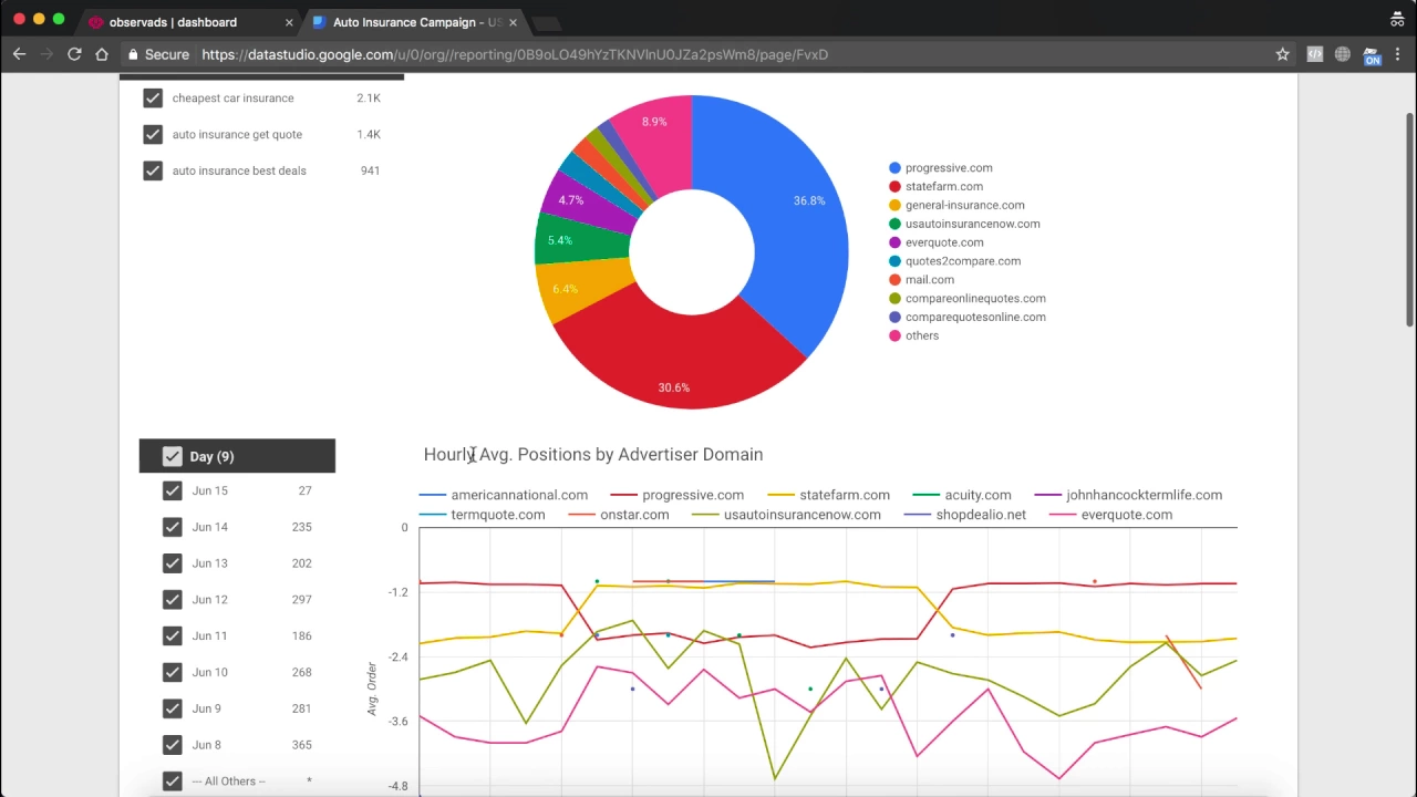 observads lets you create campaigns where you only need to type the queries you want to track (mostly top search queries from your AdWords campaign). Nicely prepared Data Studio report is shared with you afterwards in which there's hourly Average Positions, stored Ad Texts of the advertisers whose ads are shown for selected queries and much more!
