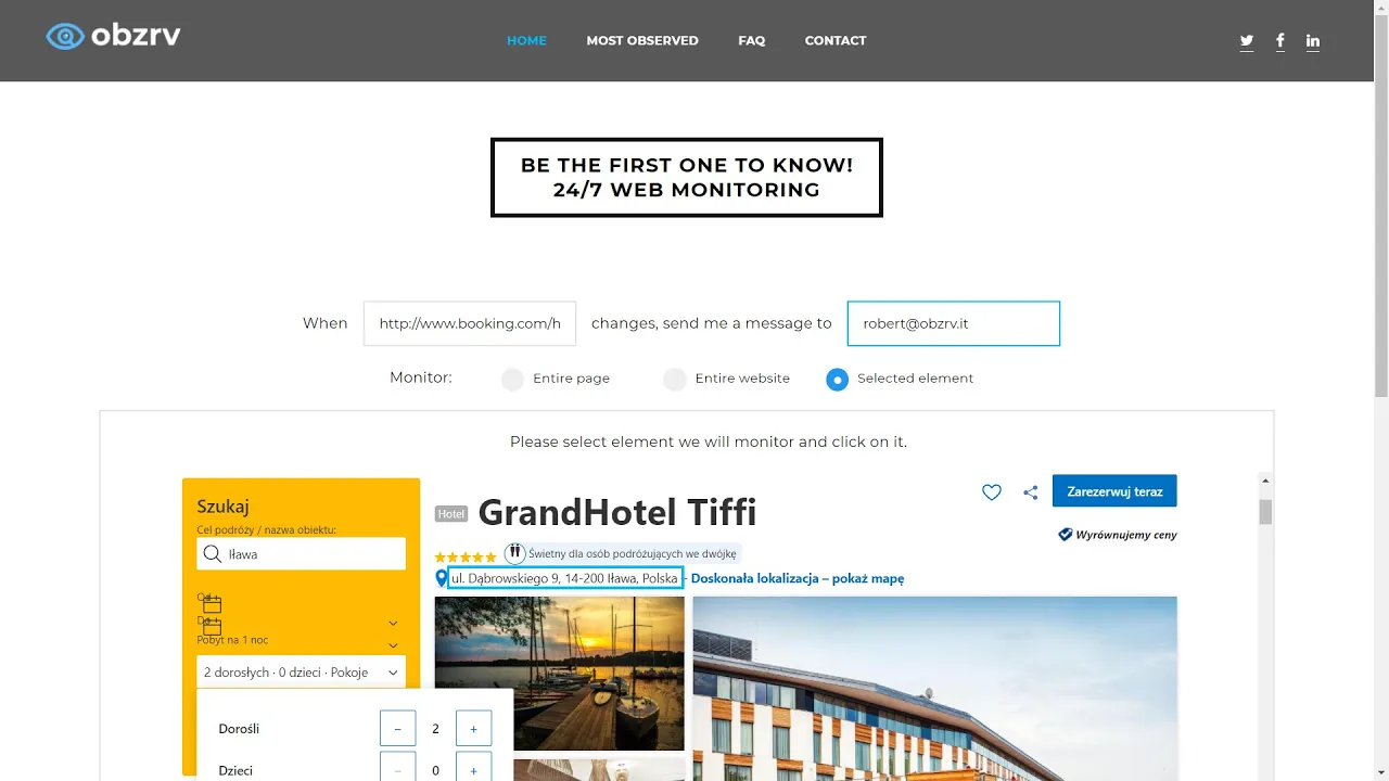 Obzrv.it is a universal web monitoring service. Our solution monitors web pages and alerts subscribers when given site, page or specific page's element changes. It's fast, easy to use and free!