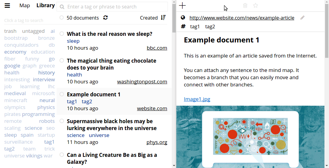 Easily organize lots of information. Attach any sentence to the mind map. Instantly return to exact document and sentence. Organize information in a hierarchical structure. Hide branches you don't need. Save websites. Write documents. Organize with tags. A lightweight tool to organize your knowledge. Perfect for writers, journalists and anyone else who works with lots of information.