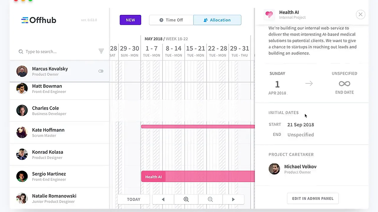 Offhub supports your company in day-to-day work by making people availability transparent and easily accessible. Get rid of multiple tools and spreadsheets used for tracking absence and project assignment in favor of one, easy to use and powerful tool.