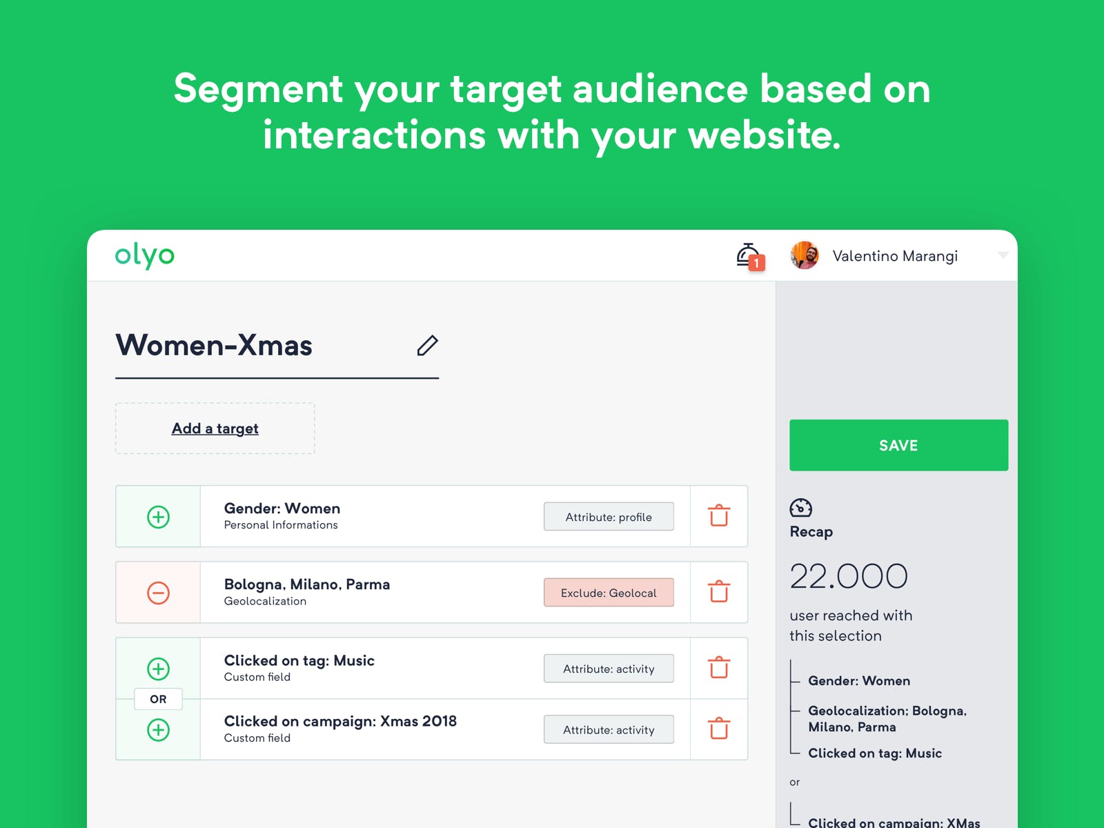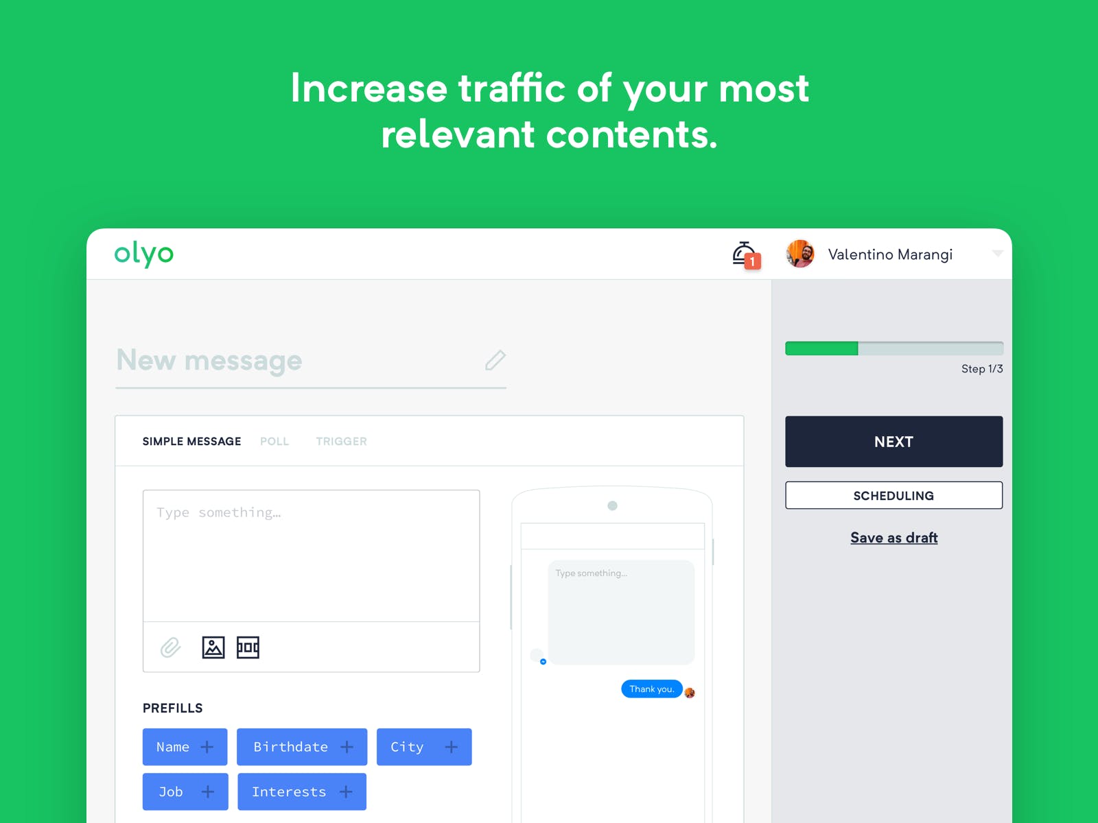 Olyo makes direct marketing via Facebook Messenger smarter, increasing the results of your campaigns to up to 12 times compared to email marketing. Olyo allows you to: - do advanced targeting on your chatbot users - create custom triggers based on activities done on your website - create a lineup between optins and the users from your crm