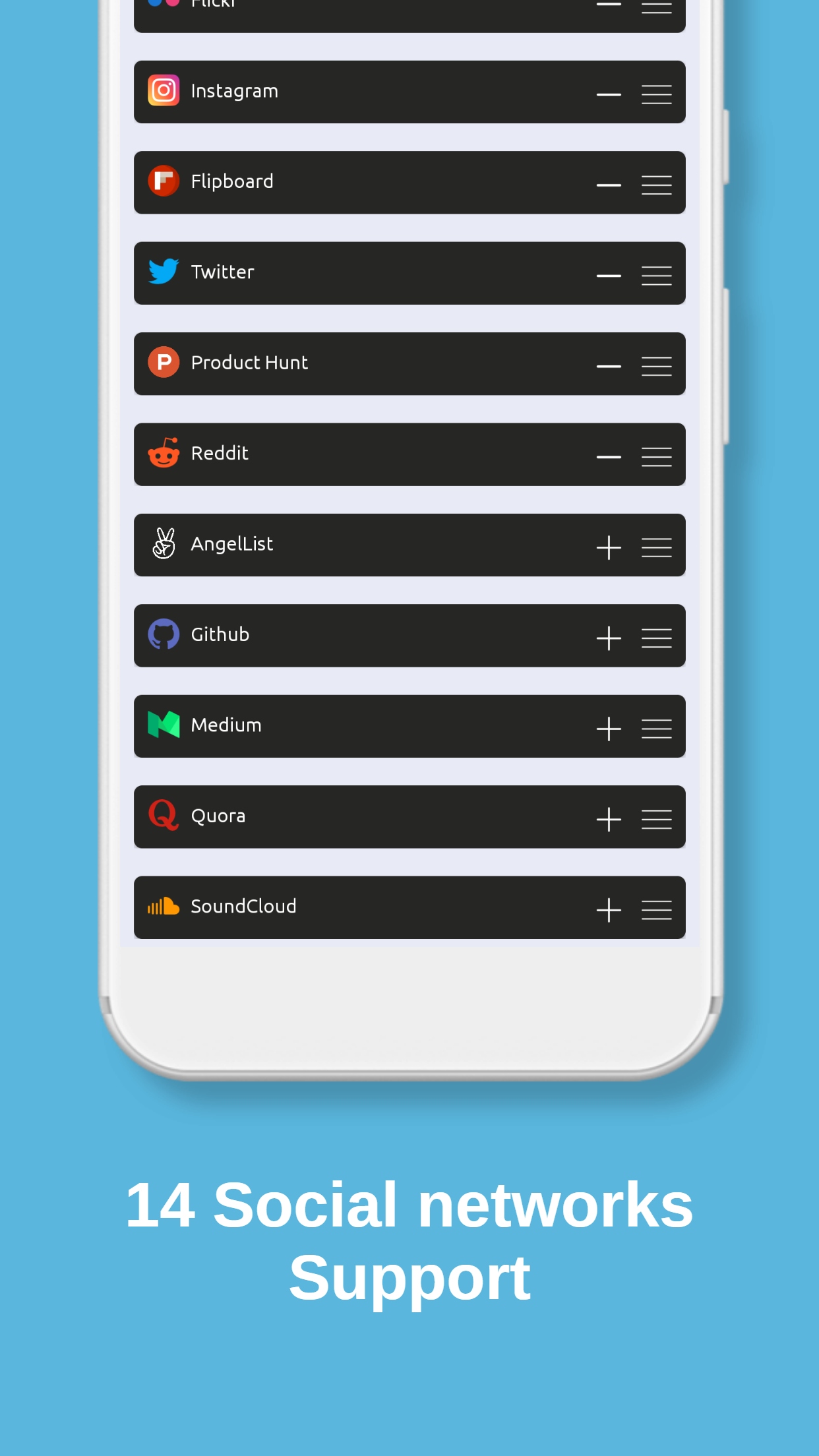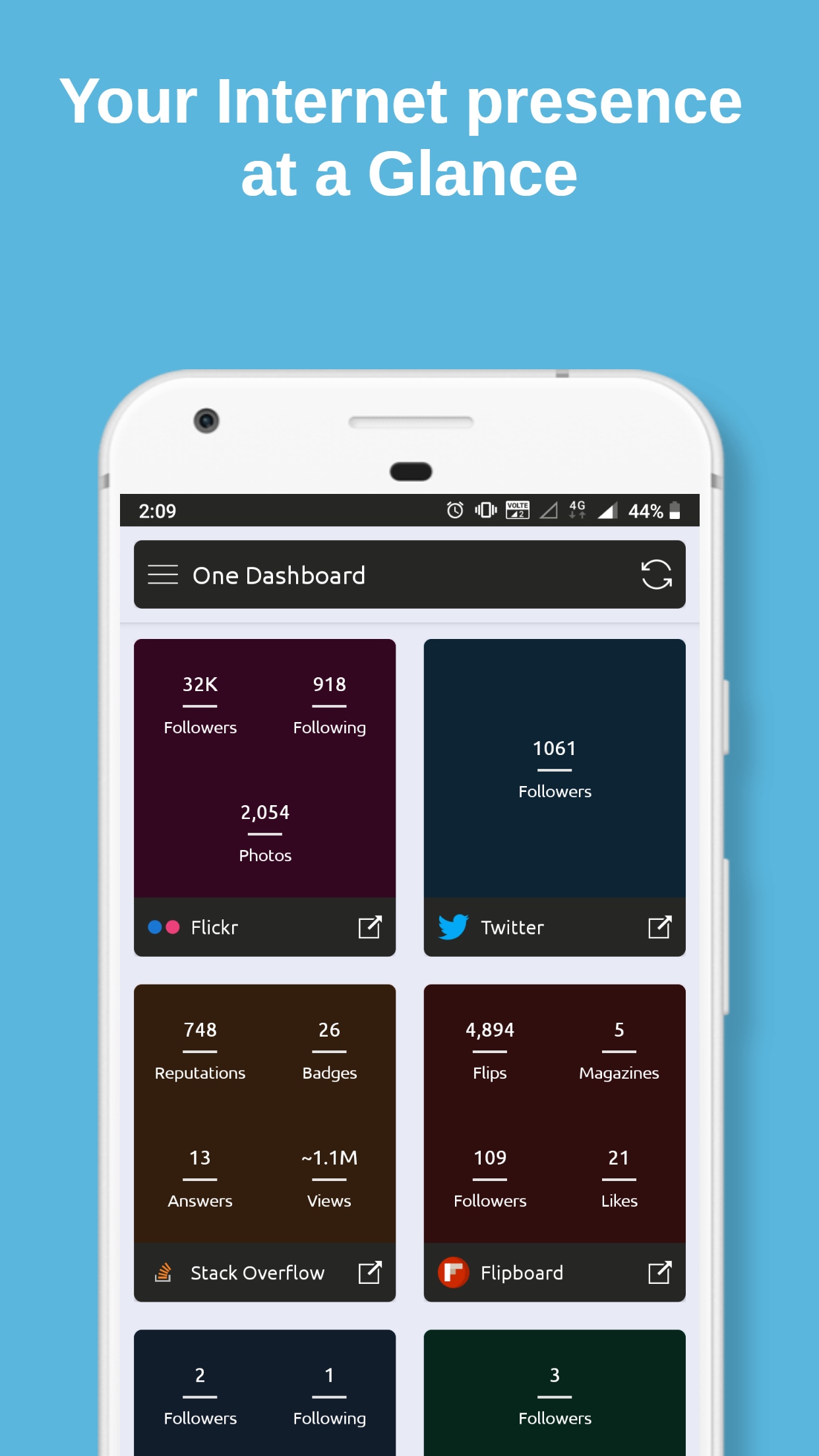 One Dashboard is a unique app which can track your Followers, followings, posts, photos, and other cool user stats in one single screen. No more going to different social networks to check if your followers count has increased. Currently One Dashboard supports 14 social network which includes: Track follower, following count. Track Instagram, Tiktok stats, number of Flickr views, Flipboard flips, magazine, likes, Reddit karma, twitter followers, and may more things. In One Dashboard app you just need to enter your username, THAT'S IT!!!! It will get into work to give you your profile insights at a glance.