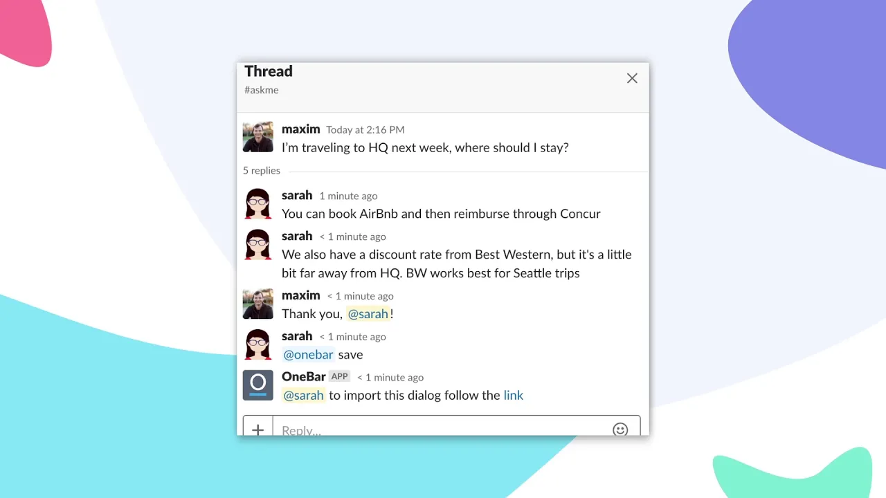 Build an AI-powered knowledge base right within your Slack team, Save messages, posts or whole threads from Slack to OneBar. Turn conversations into documentation in just a few clicks.