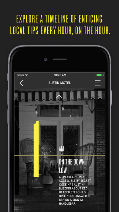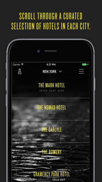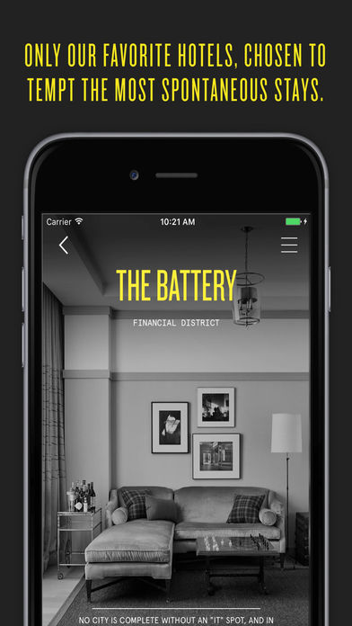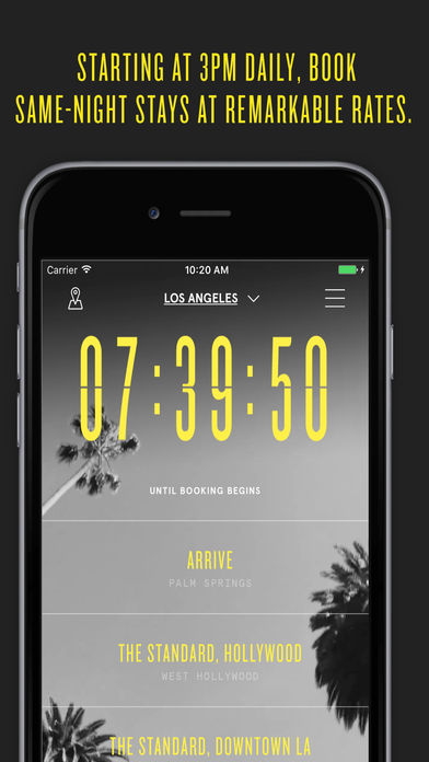 One Night is a booking app that celebrates spontaneous living by providing same night stays for a curated group of hotels in major cities. Beginning at 3pm daily, users have instantaneous access to the most remarkable hotels always at the lowest rates. The app provides an hour by hour experiential timeline that allows users to maximize their stay experience. One Night is based on the belief that no remarkable night should be spent in unremarkable settings. With just one swipe, your room will be waiting for you. The Night Begins at 3pm.