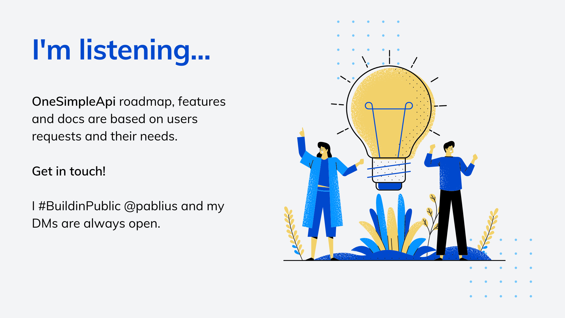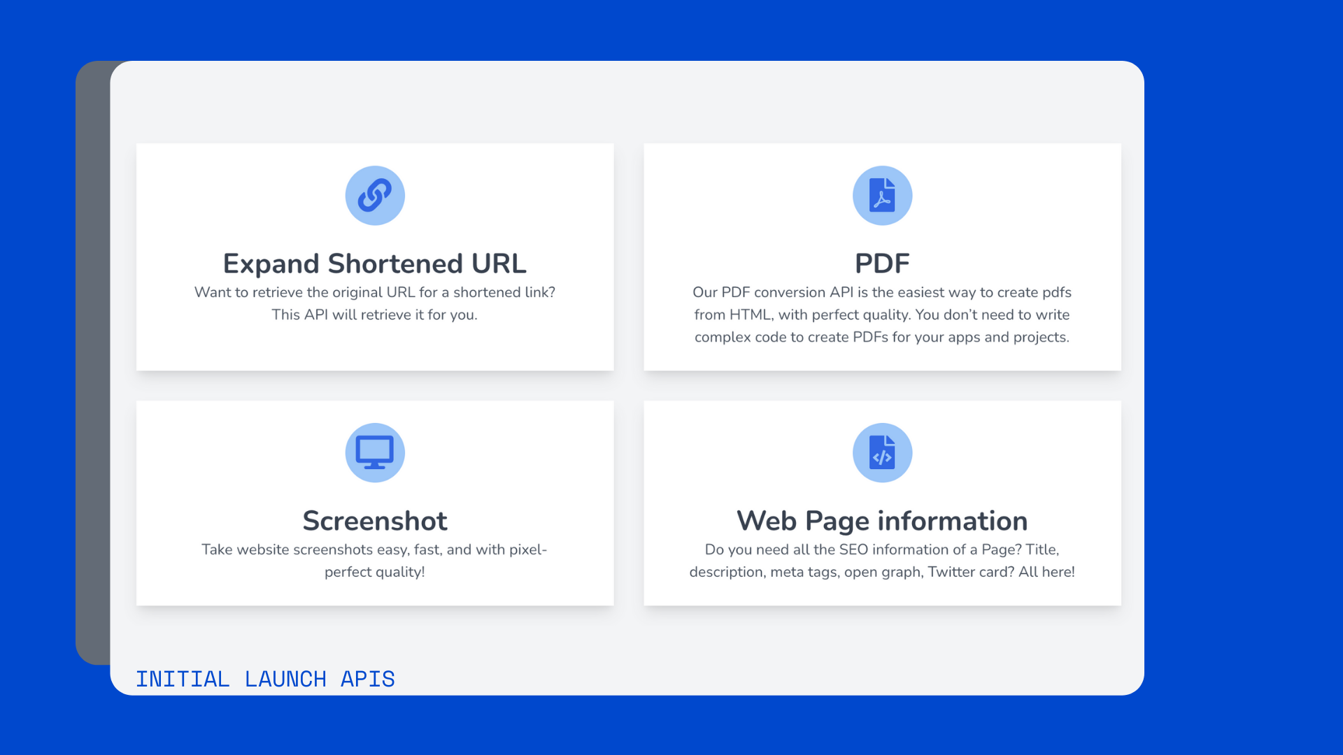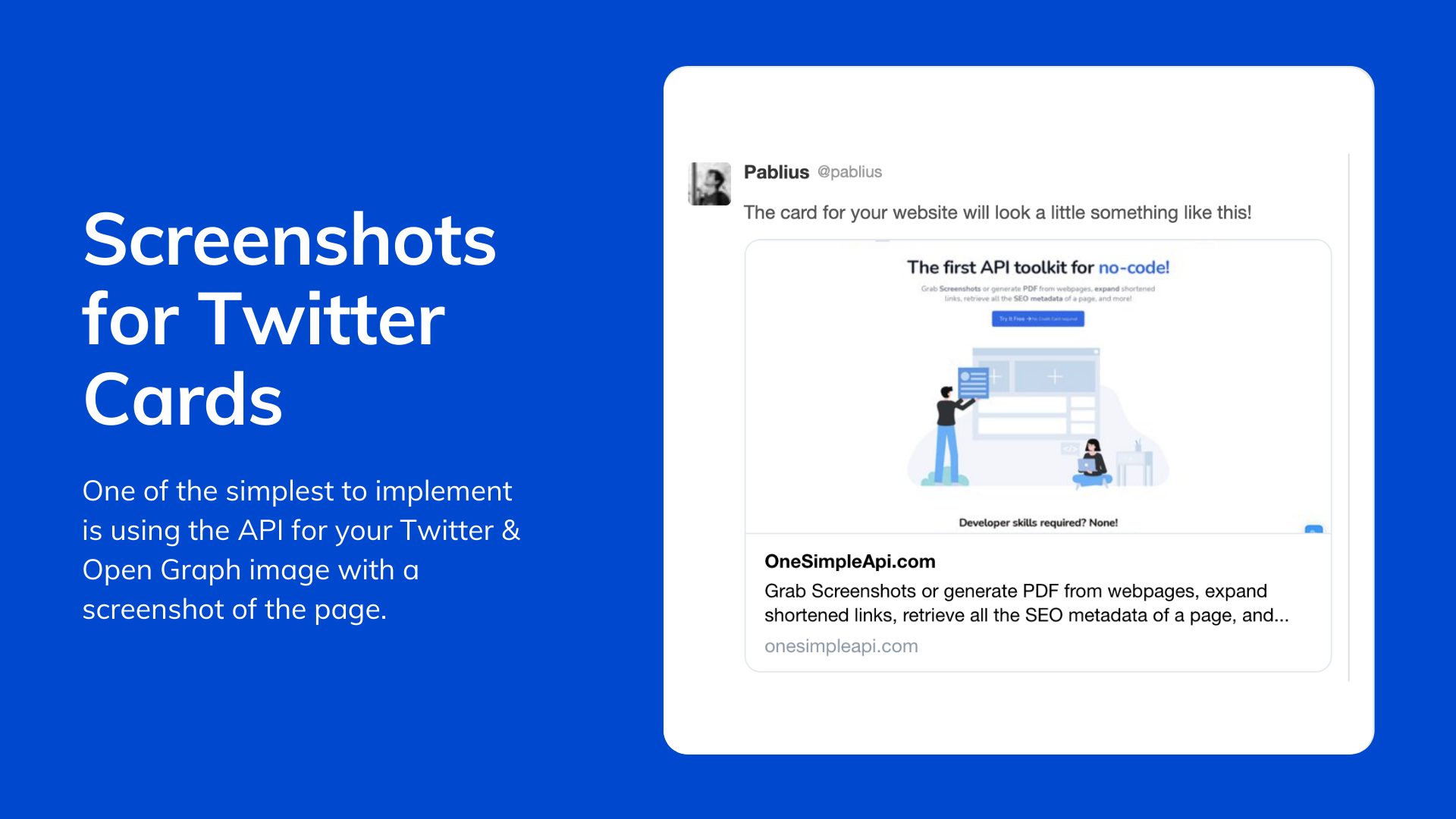 OneSimpleApi was born out of the idea that there should be a simple way of achieving complex features, when working with no-code tools. A toolbox, where you can find all the APIs that will make your creation go the extra mile: Just... One Simple API. This initial release has 4 APIs that you can test out today for free. All users registering during the launch will have the "Early adopter" badge, and will always get special perks. Expand a Shortened Link URL: simple way to retrieve the original URL from a shortened URL Screenshots: With the OneSimpleApi.com API you can take website screenshots easy, fast, and with pixel-perfect quality! PDF Generator: Our PDF conversion API is the easiest way to create pdfs from HTML, with perfect quality. You don’t need to write complex code to create PDFs for your apps and projects. Web Page information, Meta tags, Twitter card & Open Graph: Do you need all the SEO information on a Page? With OneSimpleApi.com you can retrieve Title, description, meta tags, open graph, Twitter card, (even headers if you want) all with just one API! We actually have a 5th API, for those math inclined: Divide by zero: We created an API tells you the true result of dividing a number by zero. You might be wondering, there are many sites that let me do some of these things, what's the difference here? 1 - I strive to make it simple, all the way around. So you only spend the minimum time needed to have it working and you're done. OneSimpleApi takes care of the complexities, you enjoy your time. 2 - Yes, there are many separate options, but nobody wants 5 different subscriptions to keep up with. The idea of a toolbox is that you will just need one, and have all the things you need available for you. And they will be simple to implement! Just one more thing... I'm always driven by the users feedback. You can see what are the APIs that will be available soon, and also suggest the ones you need. I build in public @pablius and my DMs are always open.