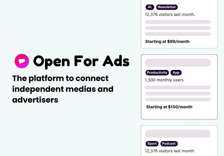 Open For Ads is a platform to connect independent media and advertisers. Simple, Free and without commissions. You know how much of a pain it is to research and send emails to sponsors just to never hear back? Well, Open For Ads takes care of all of that. All you have to do is create an account, add your media and start getting advertisers. And if you're an advertiser, I know how frustrating it can be to try to scale up your product. Organic growth is great, but it takes time. And let's be real, half of the time you end up being banned for no reason. Open For Ads makes it super easy to find the perfect audience for your product. Just filter by size, budget, and other criteria and boom, you're good to go. It's seriously so easy.
